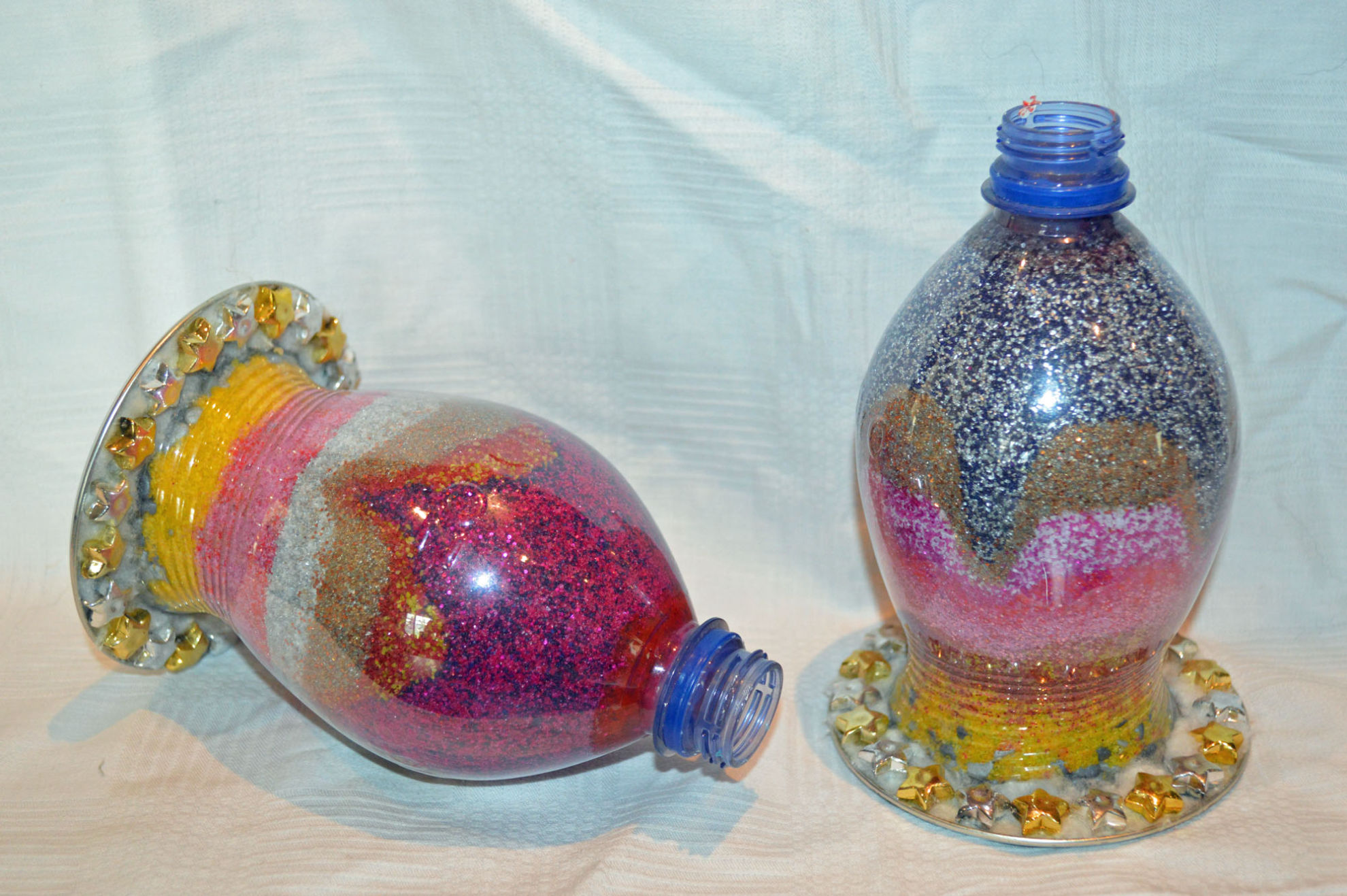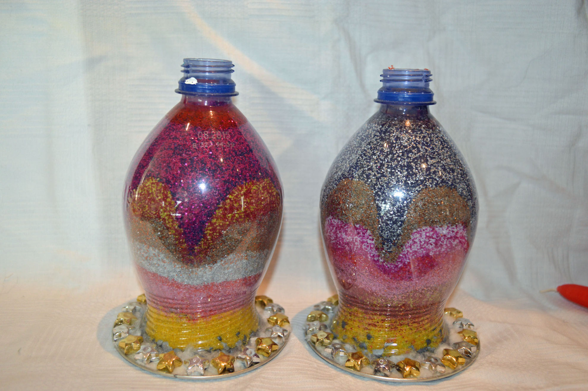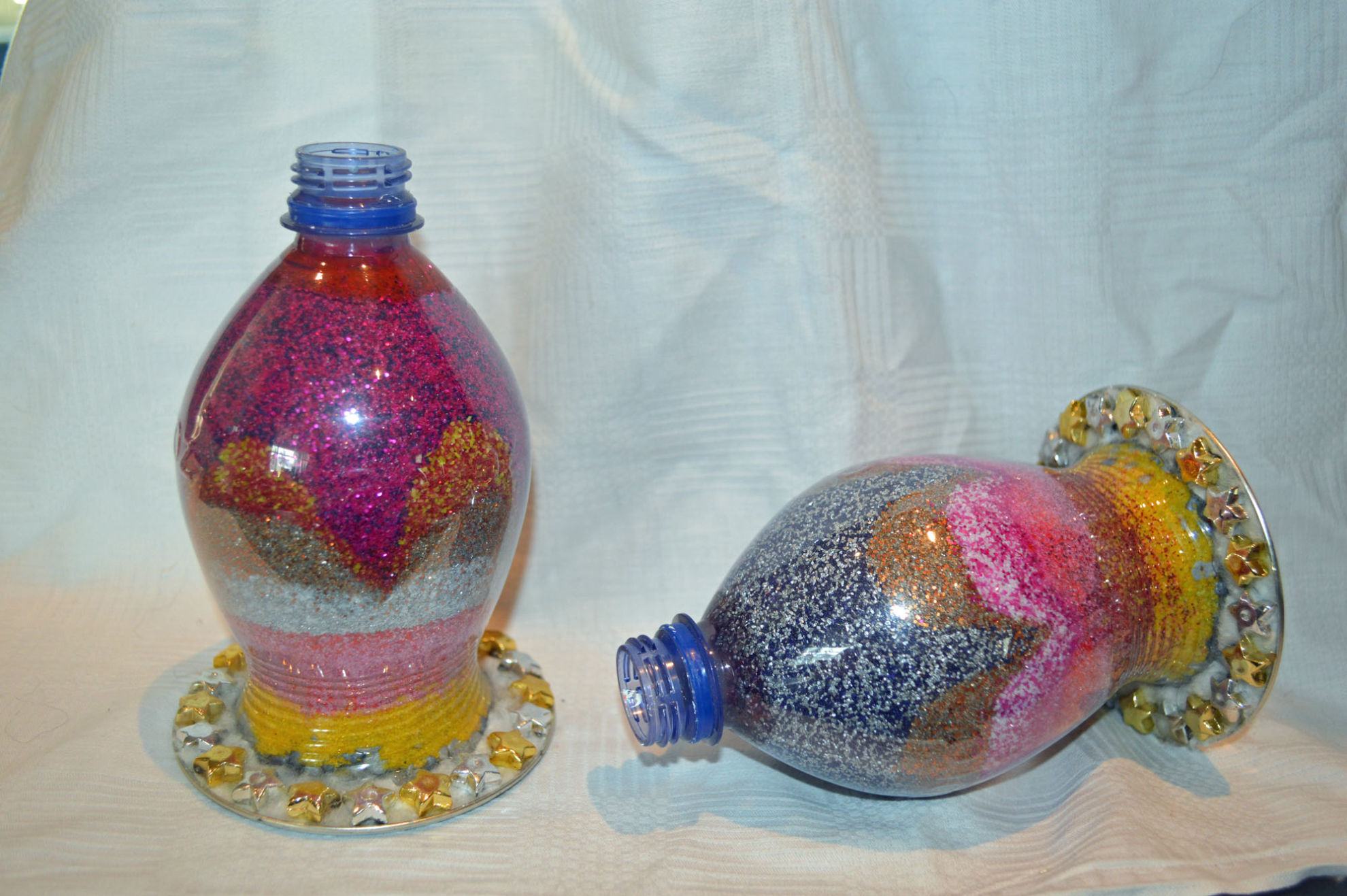 Material: PET Flasche 1.5l und Boden ist einem Alu Dosendeckel, Gefüllt mit Buntem Dekor-Sand. Dekosterne, Watte