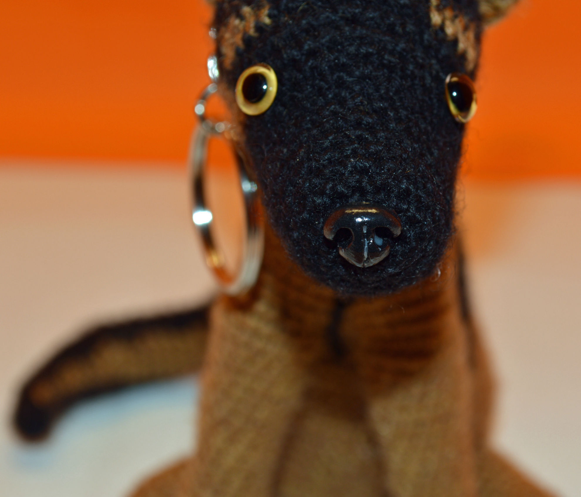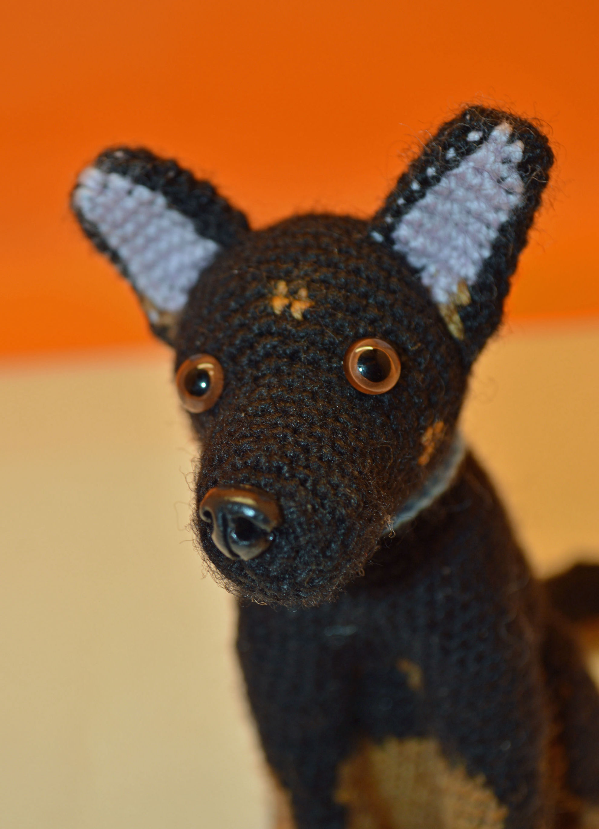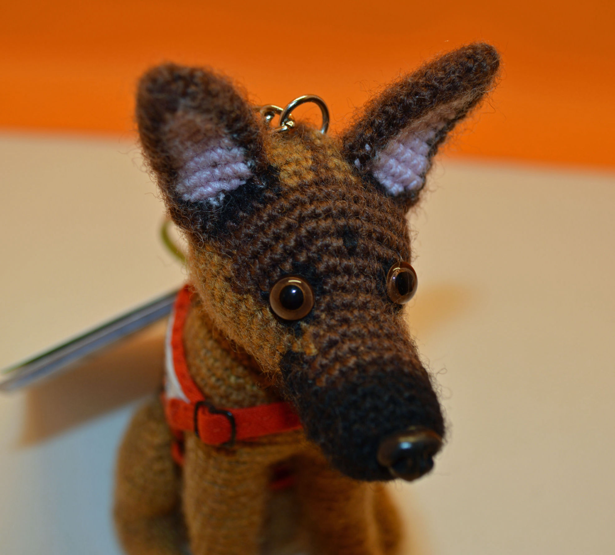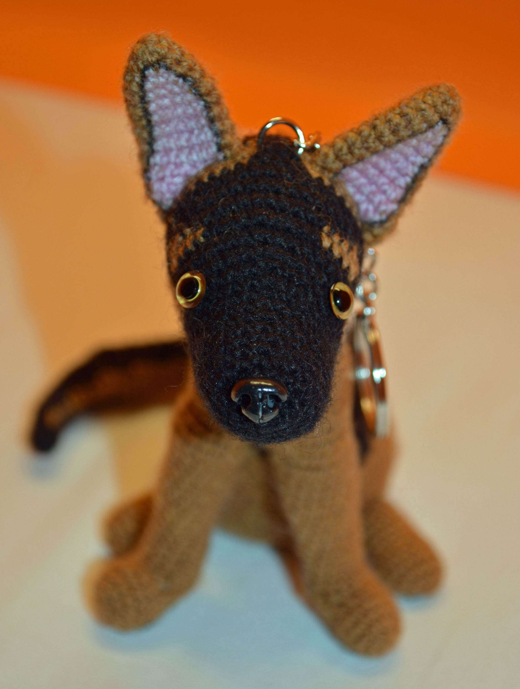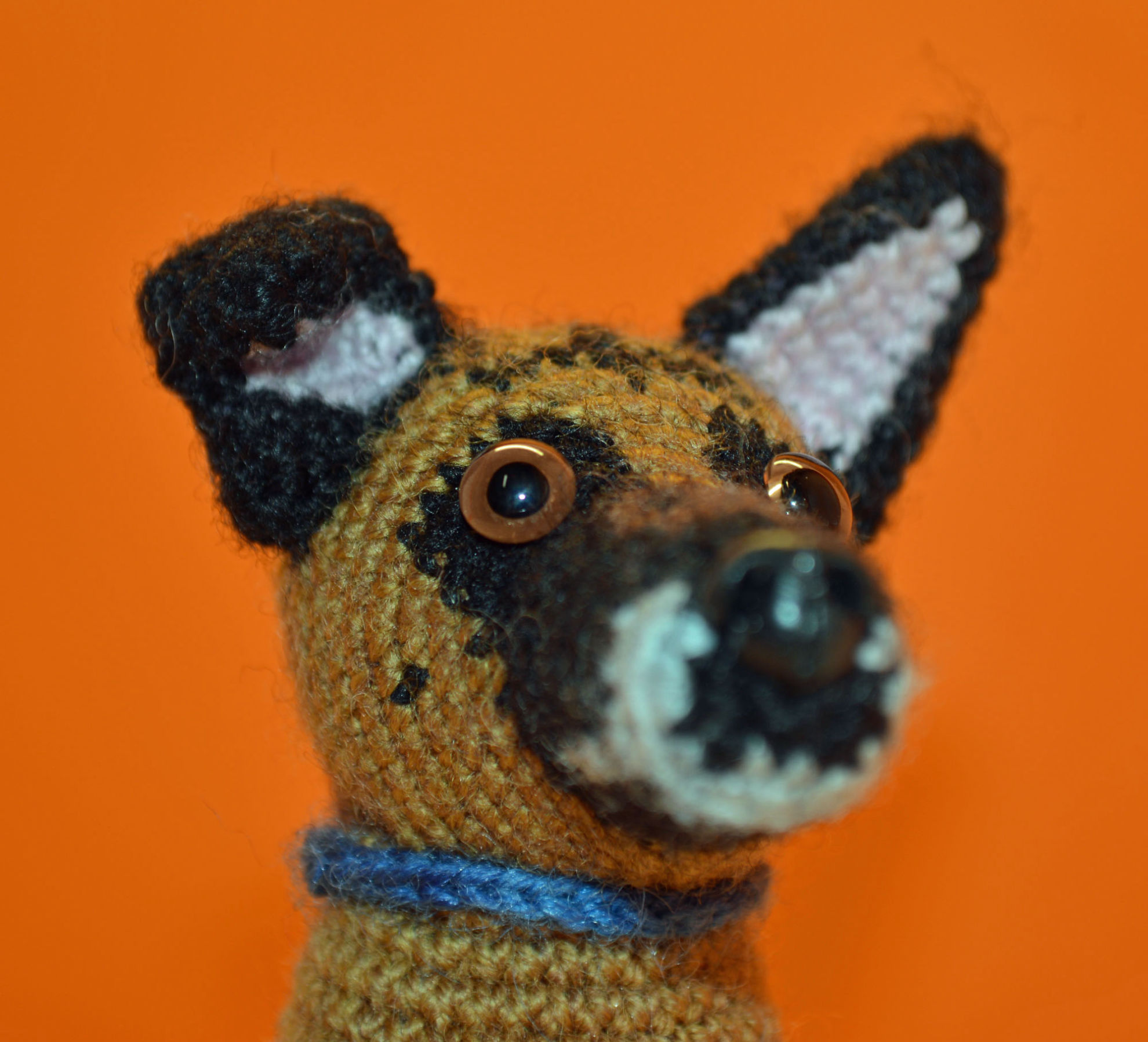 Material: Wolle verschiedene, Glasaugen, Hundenase Fimo (selbst gemacht), Bauernmalfarbe, Bastelwatte