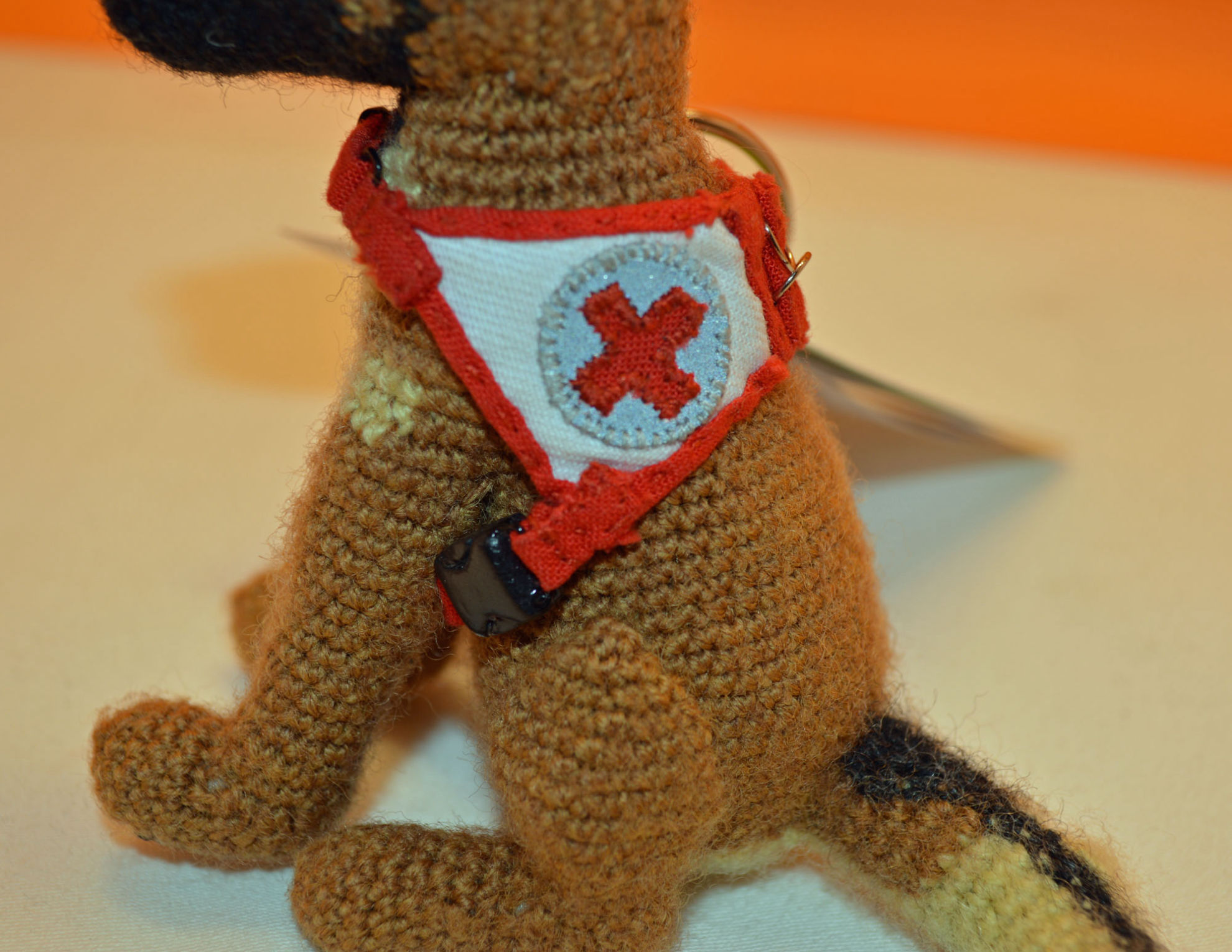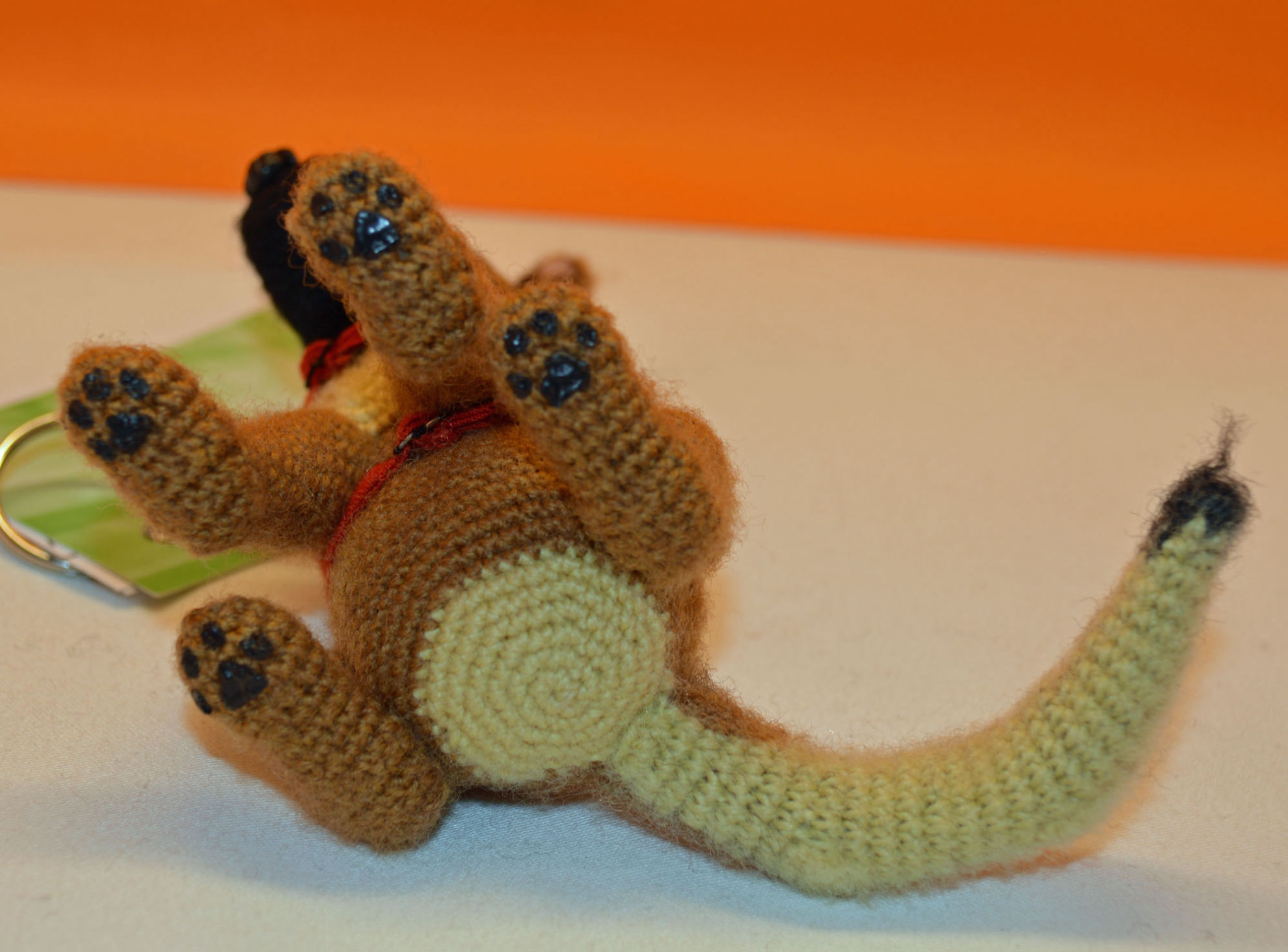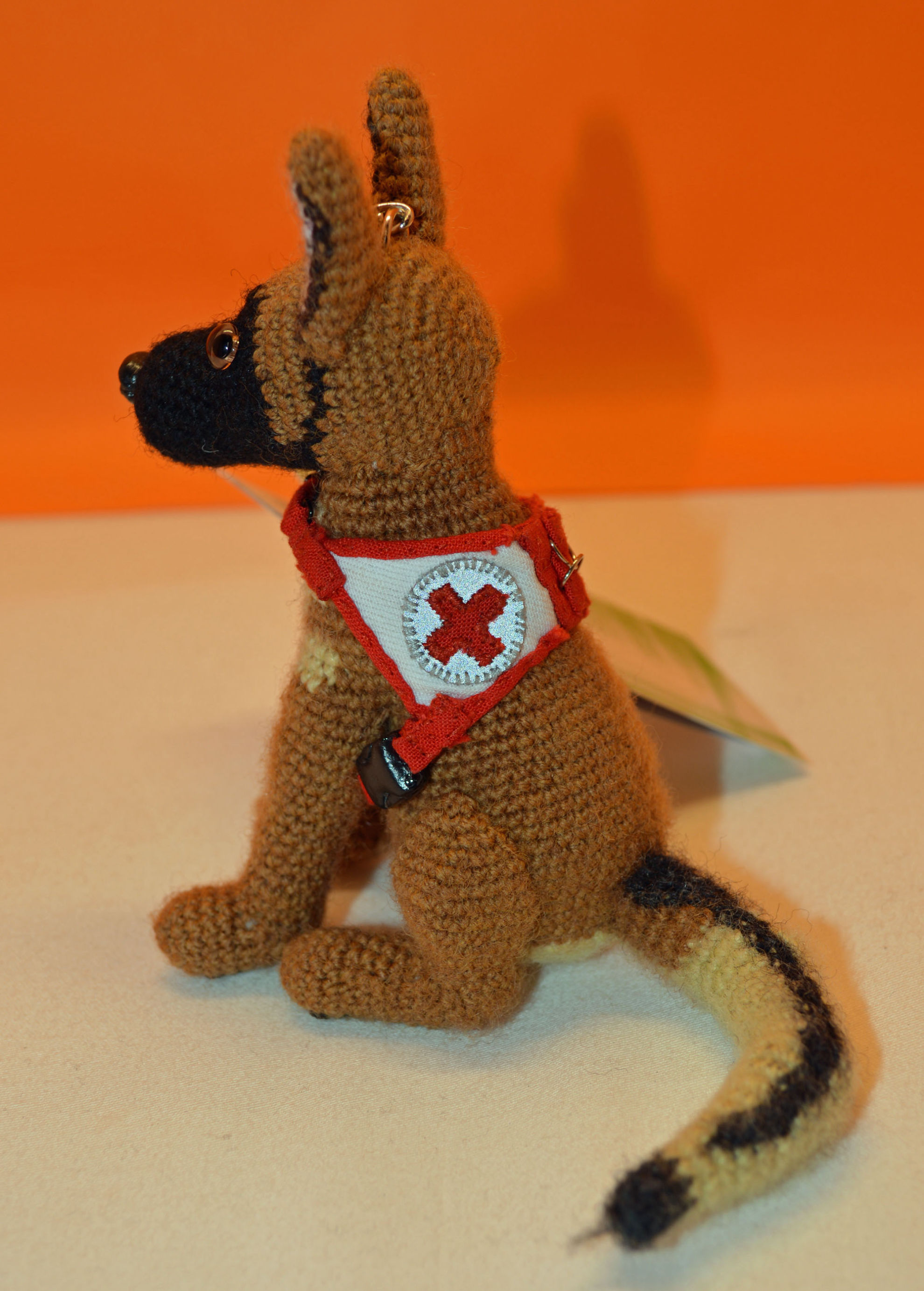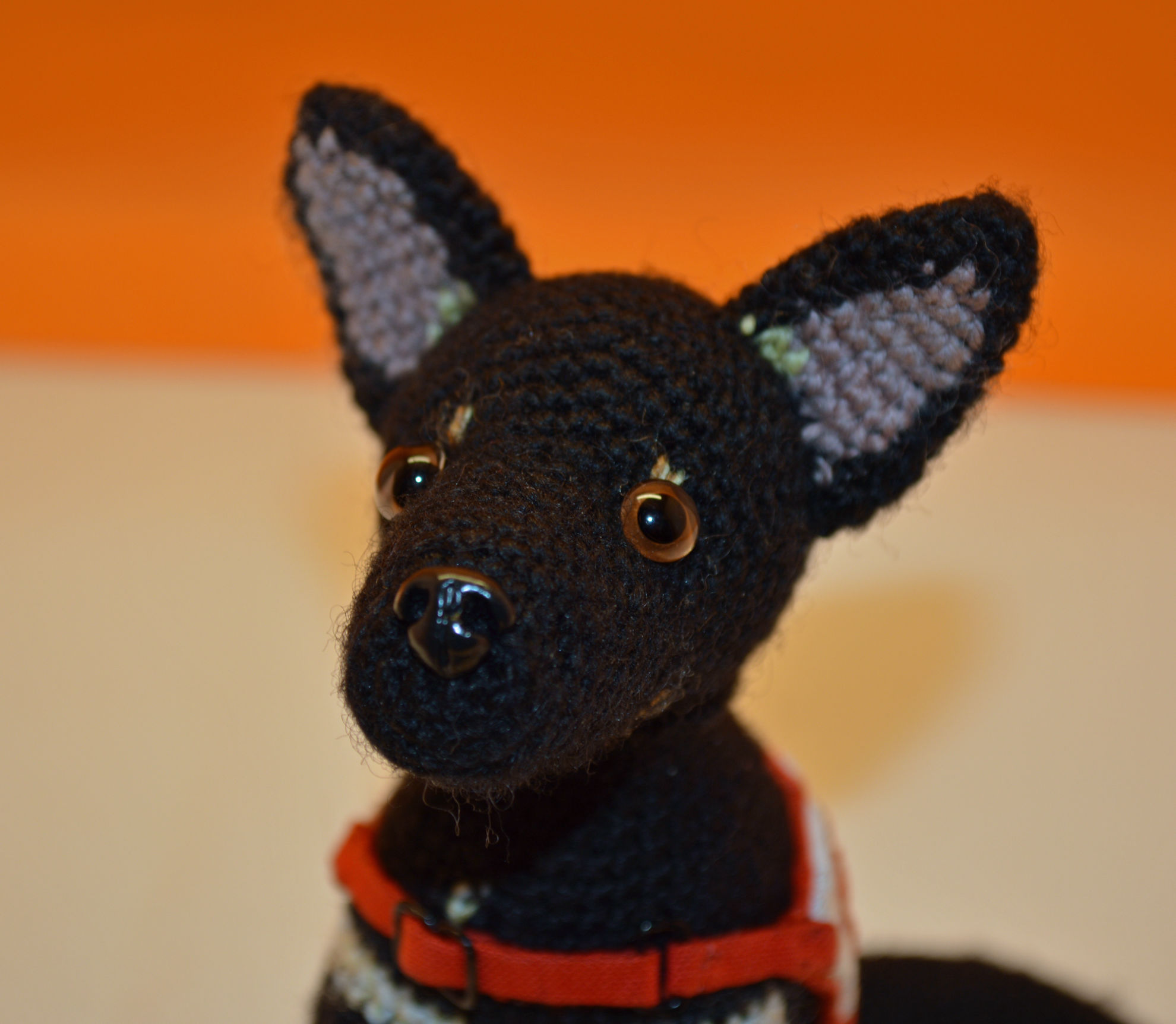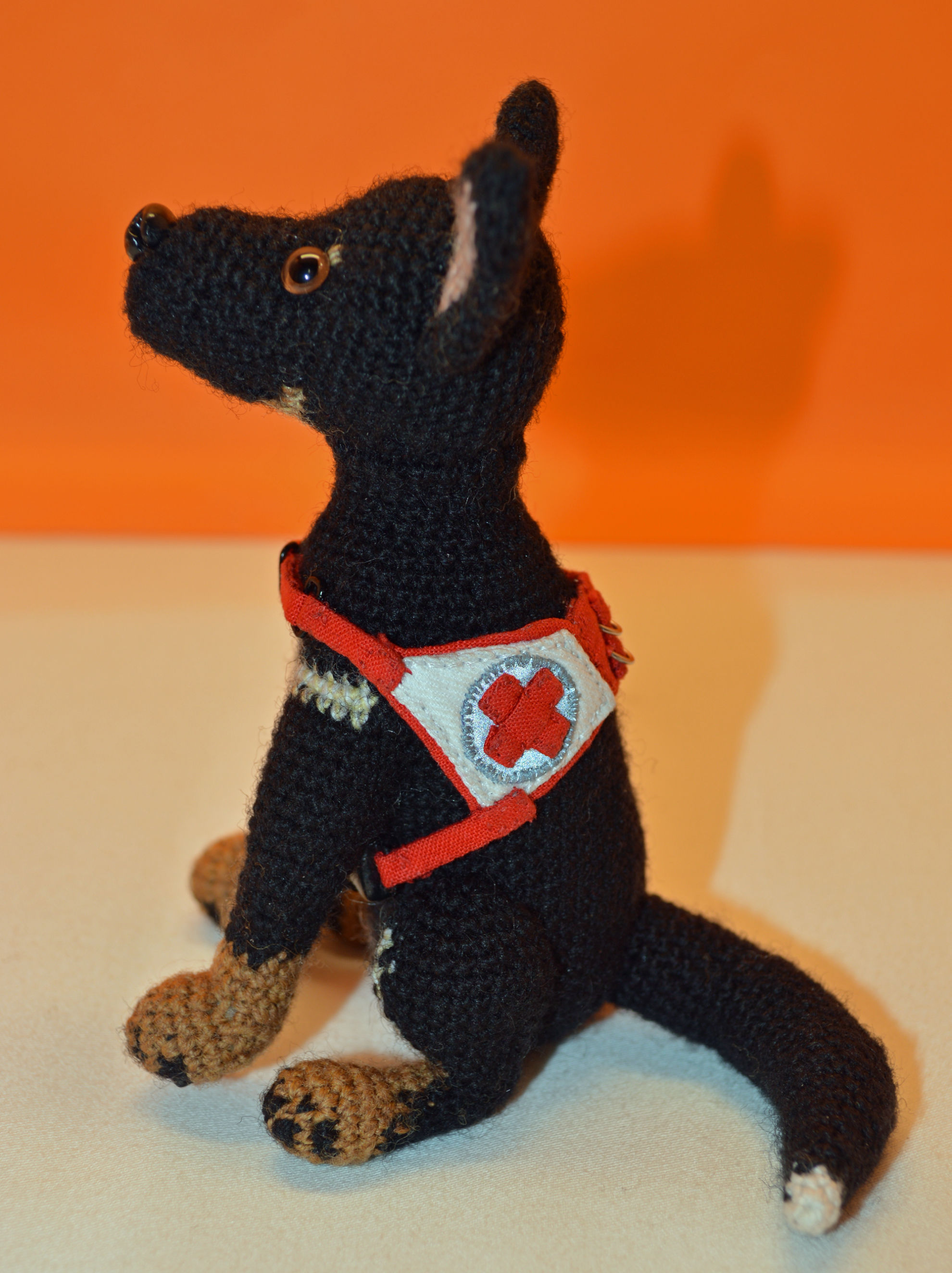 Material: Wolle verschiedene, Glasaugen, Hundenase Fimo (selbst gemacht), Bauernmalfarbe, Bastelwatte