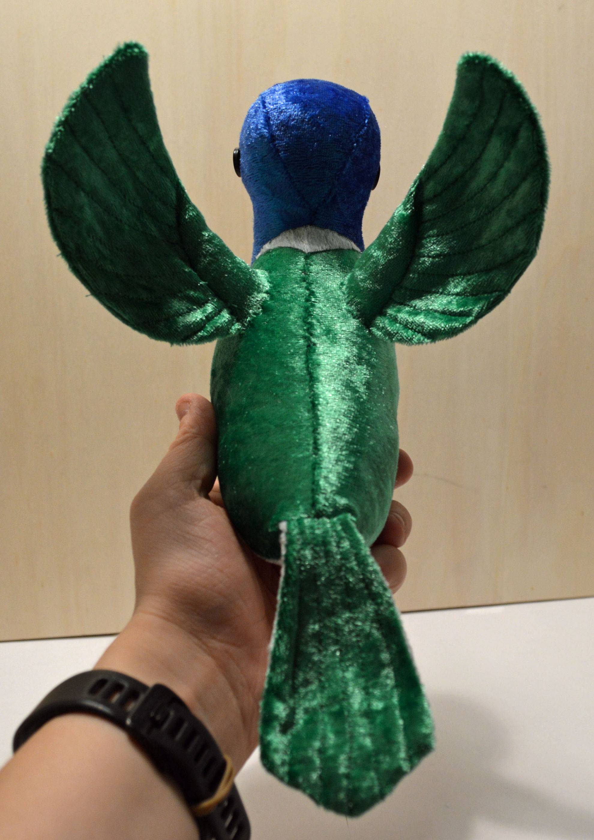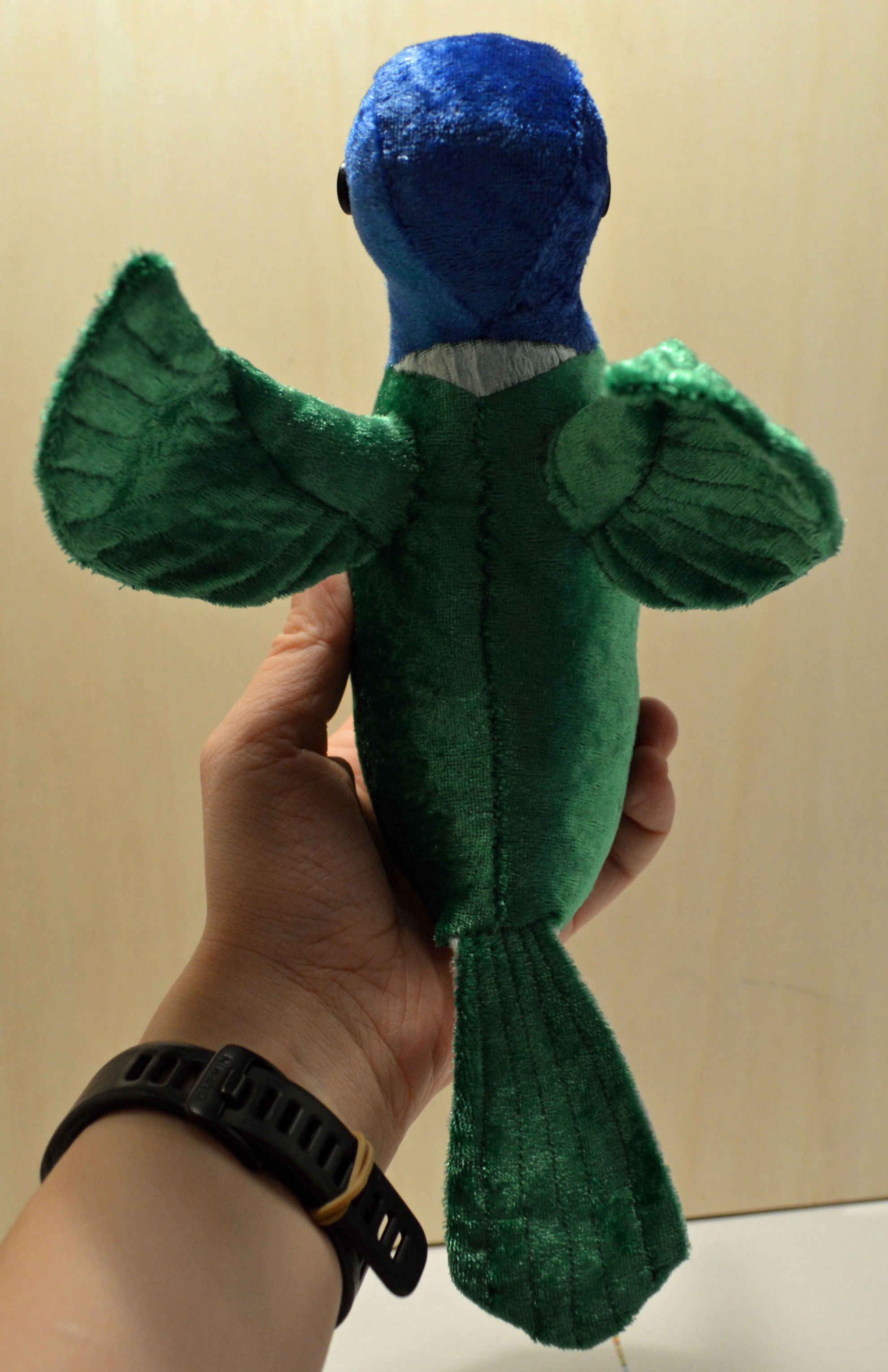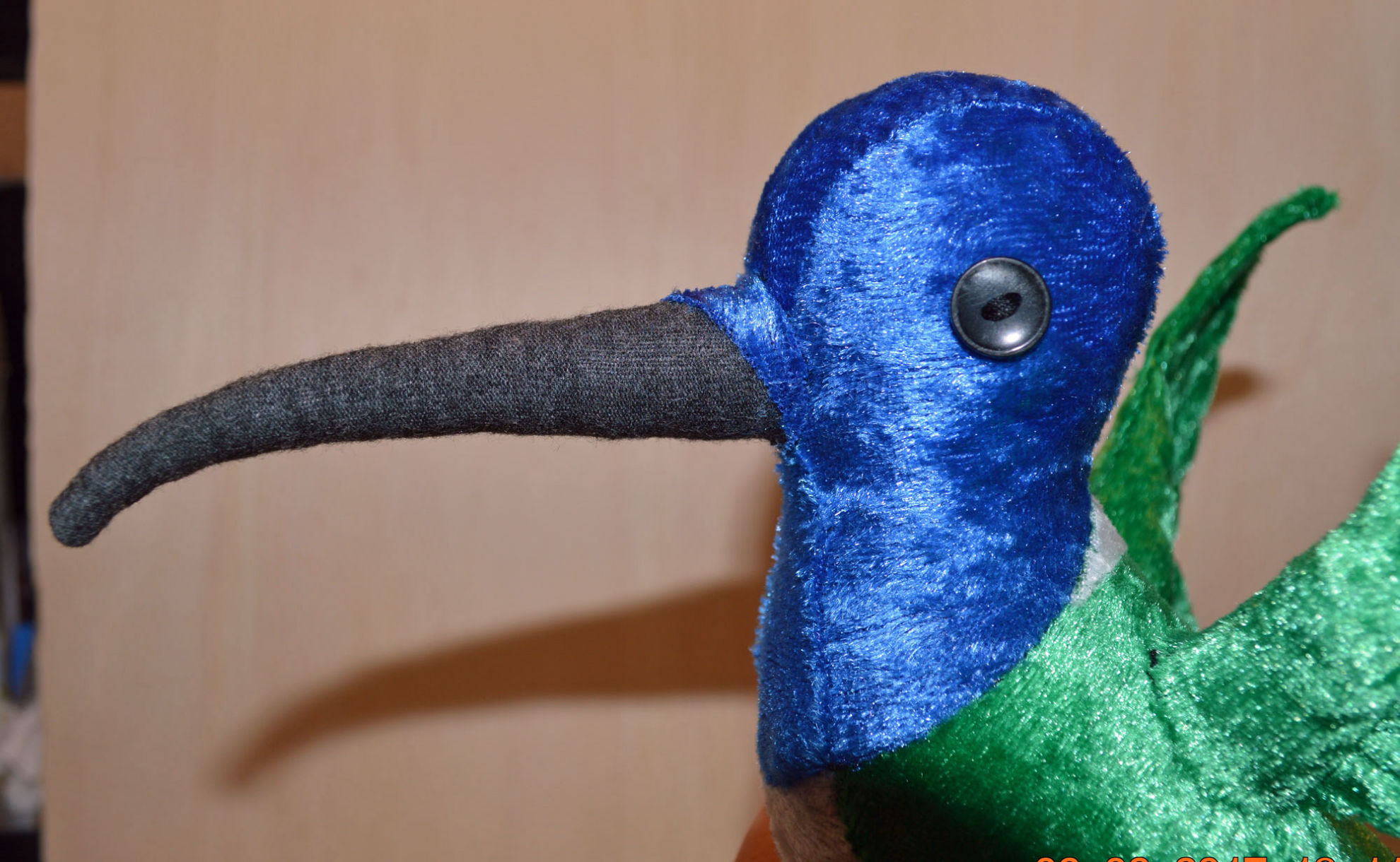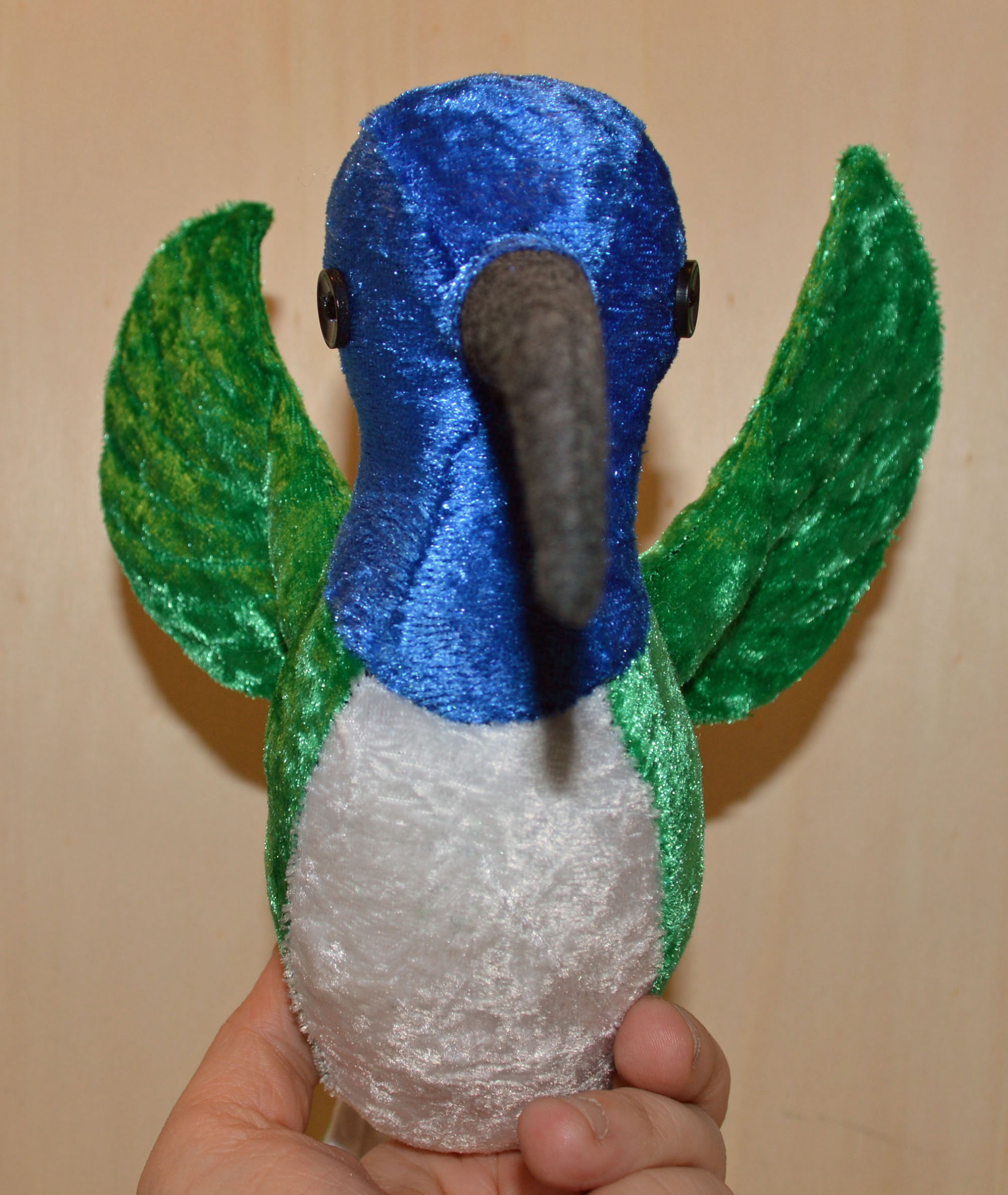 Material: Stoff Grün, Blau, Weiss, Jerseystoff Grau, Knöpfe, Bastelwatte