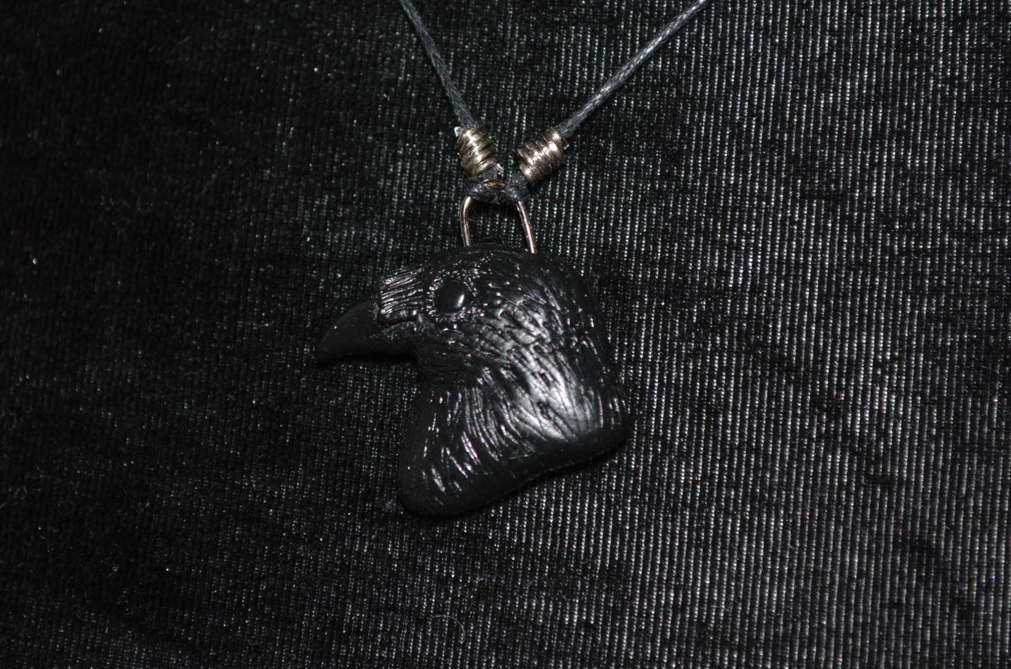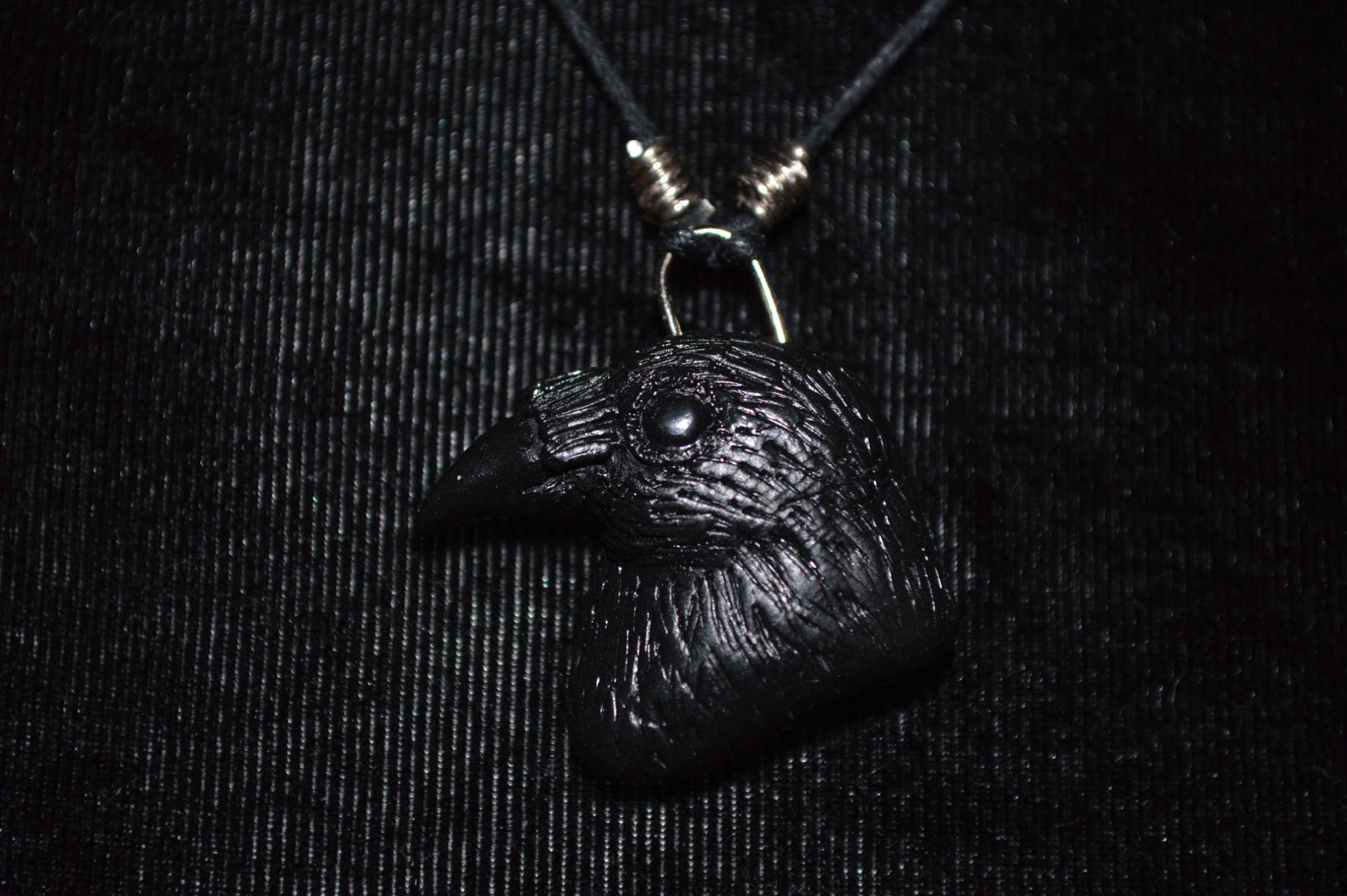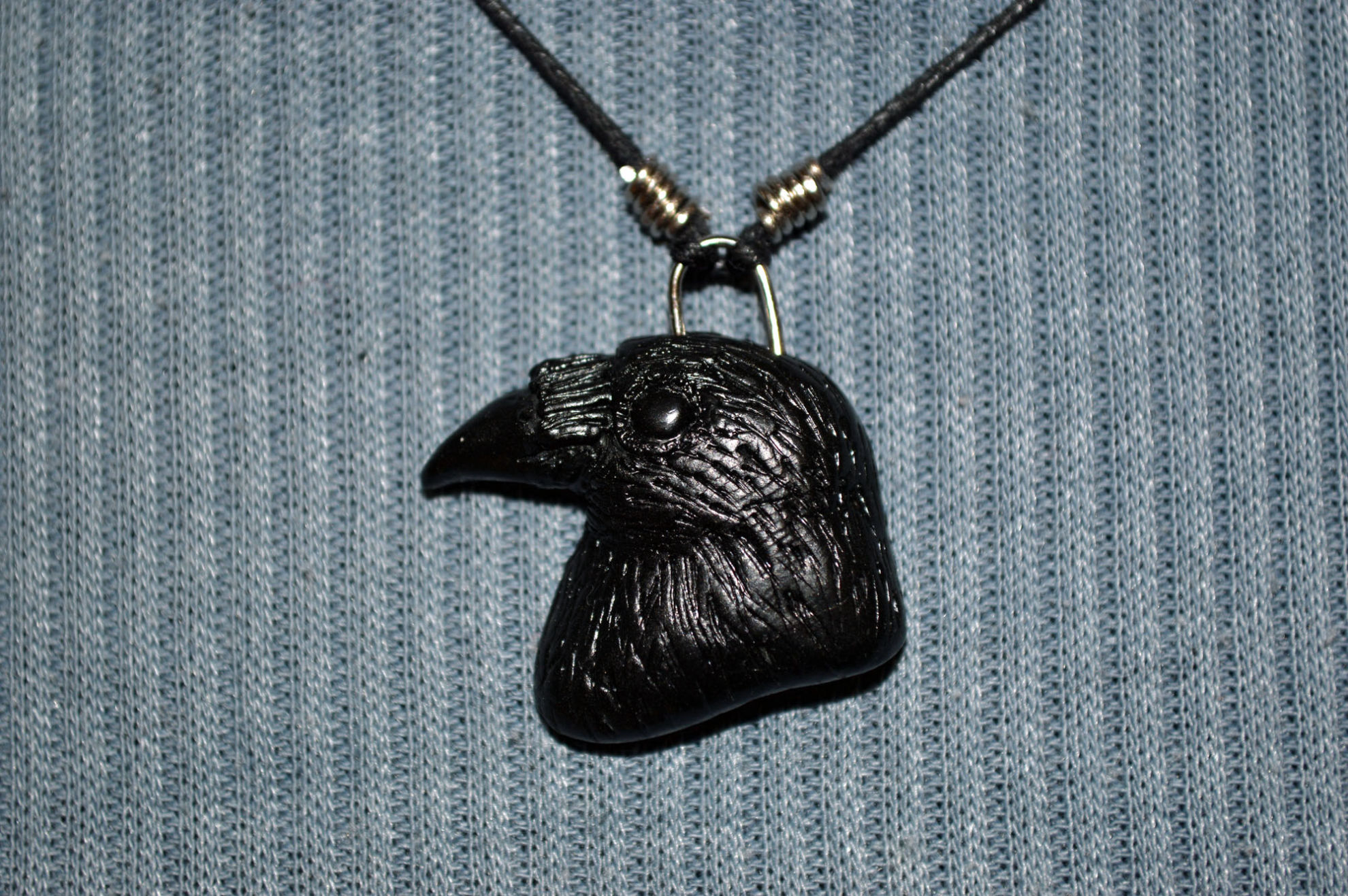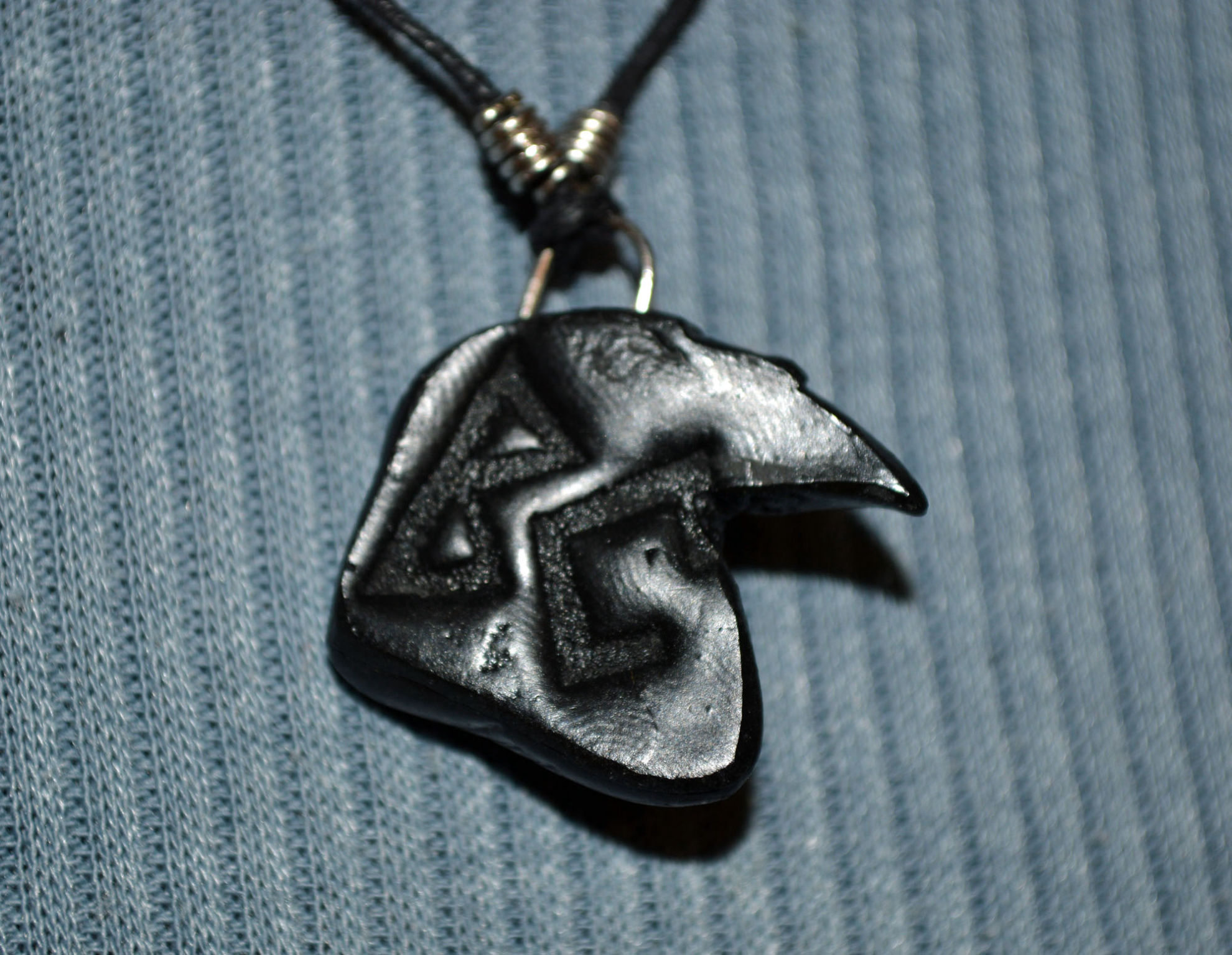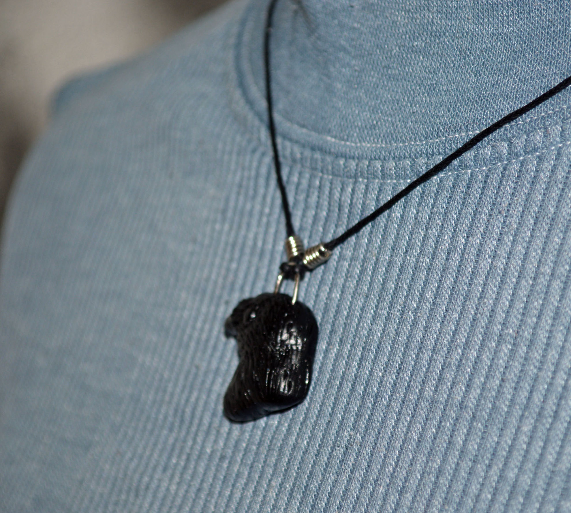 Material: Fimo Schwarz, Baumwollband, Büroklammerdraht, Lederbandverschluss