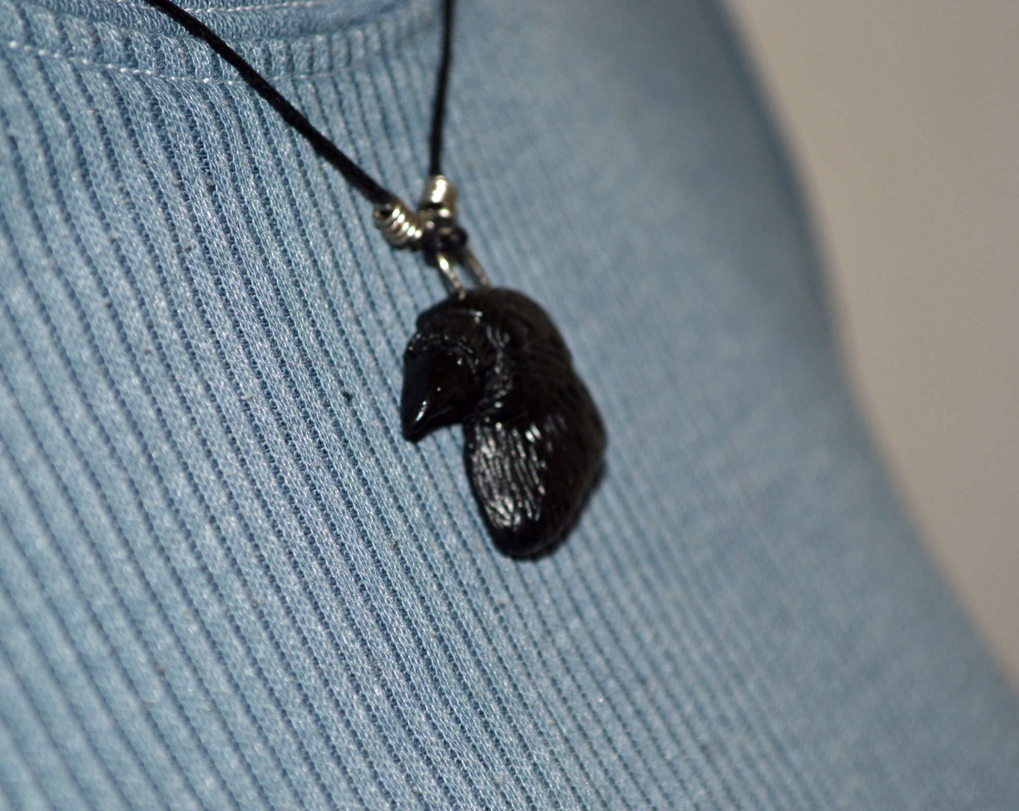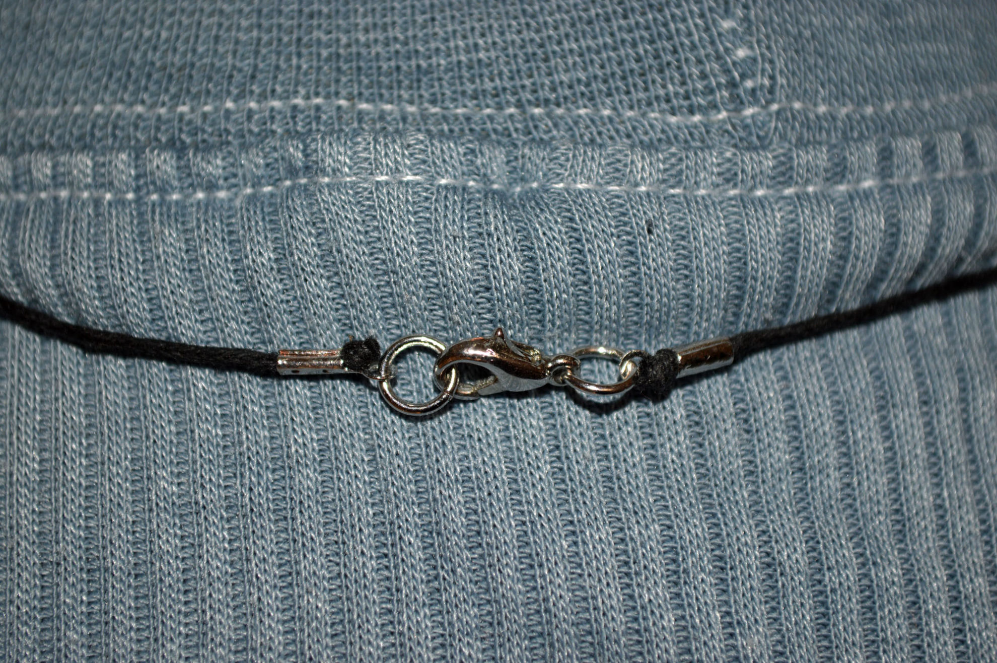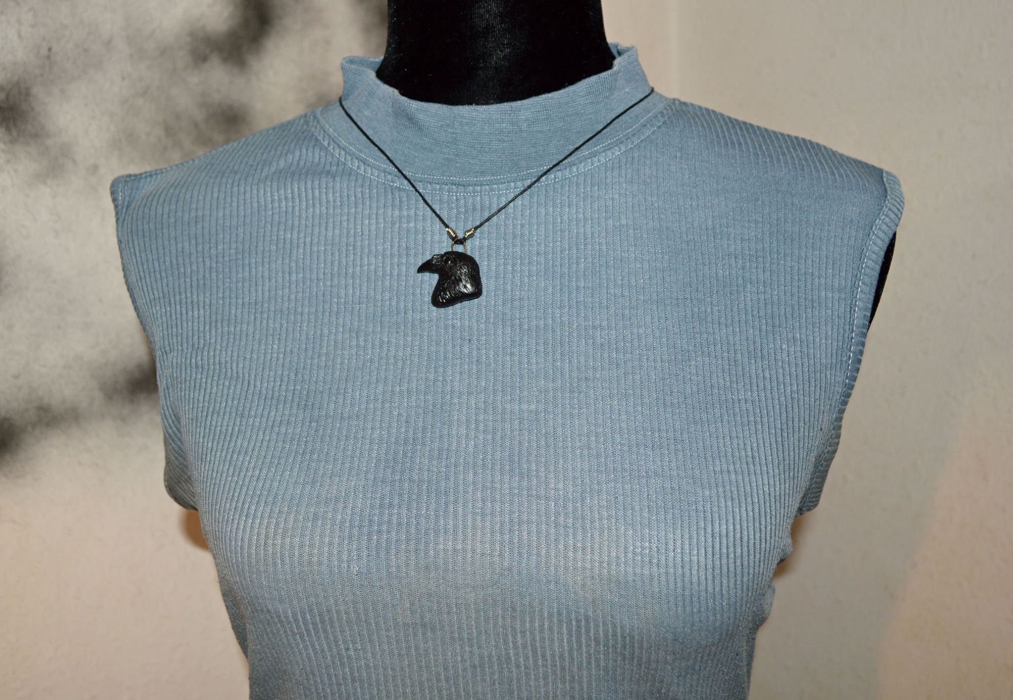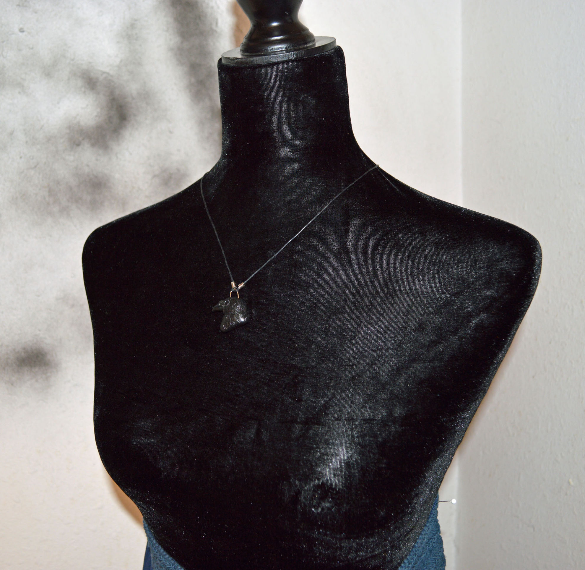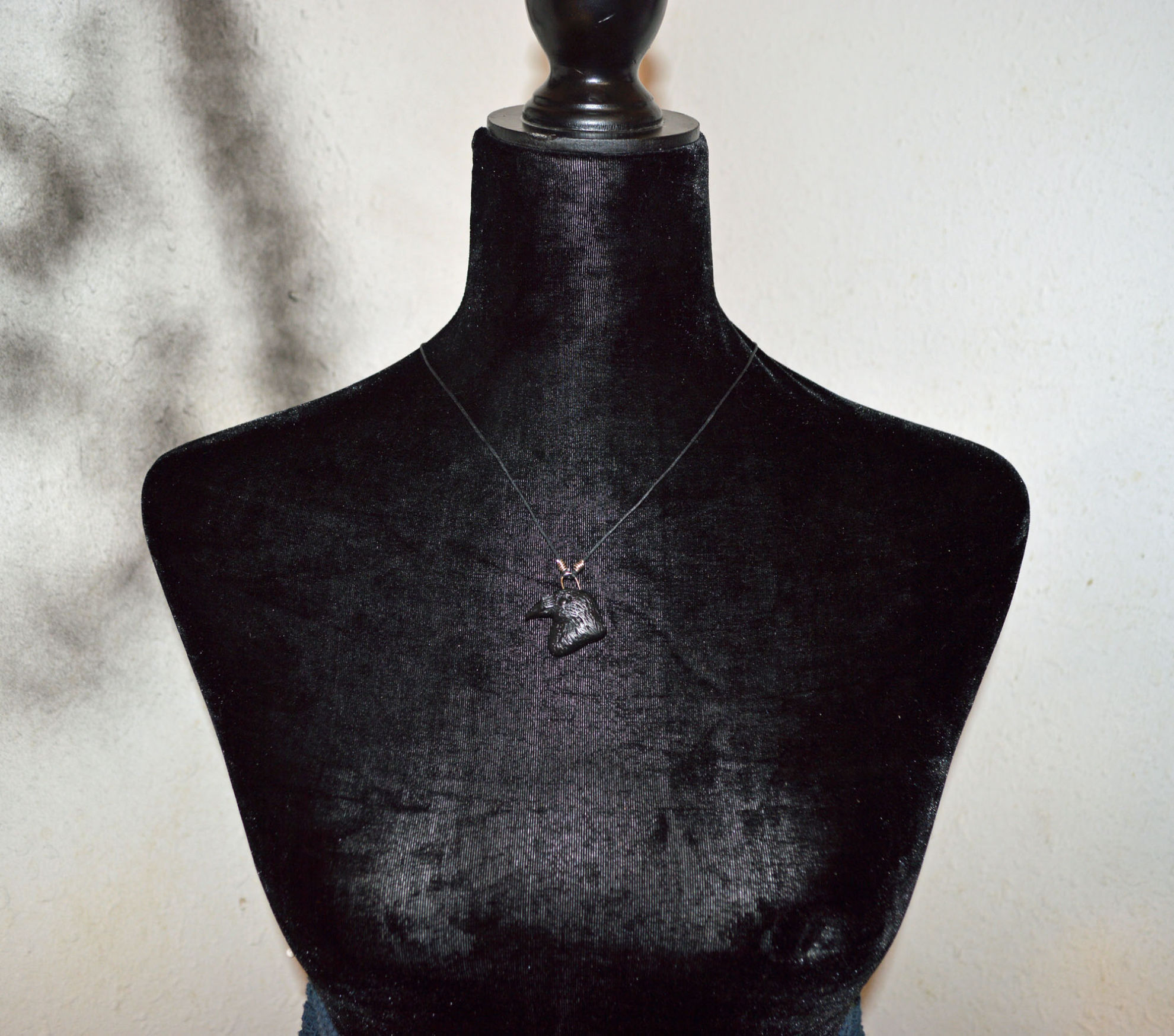Material: Fimo Schwarz, Baumwollband, Büroklammerdraht, Lederbandverschluss