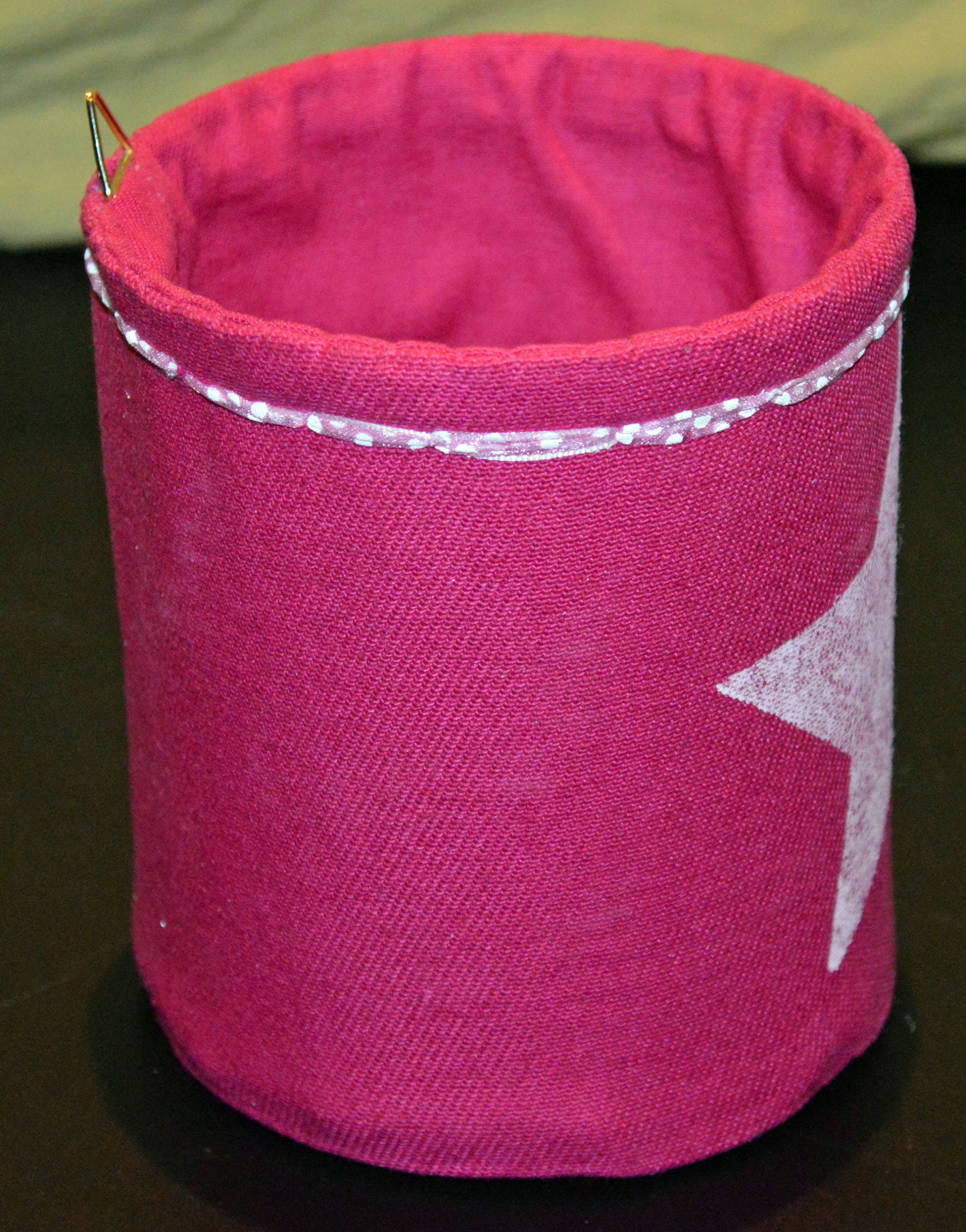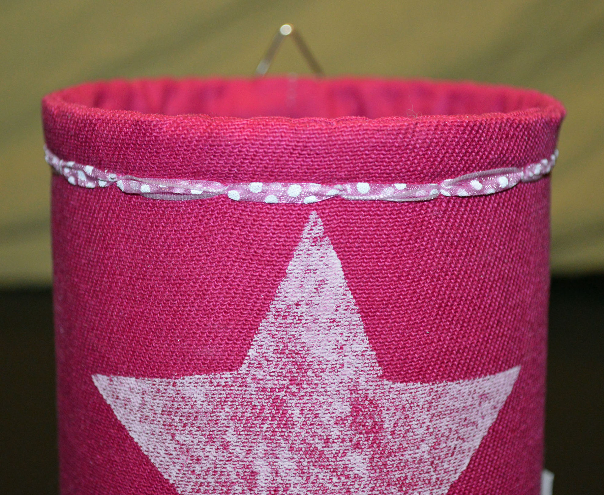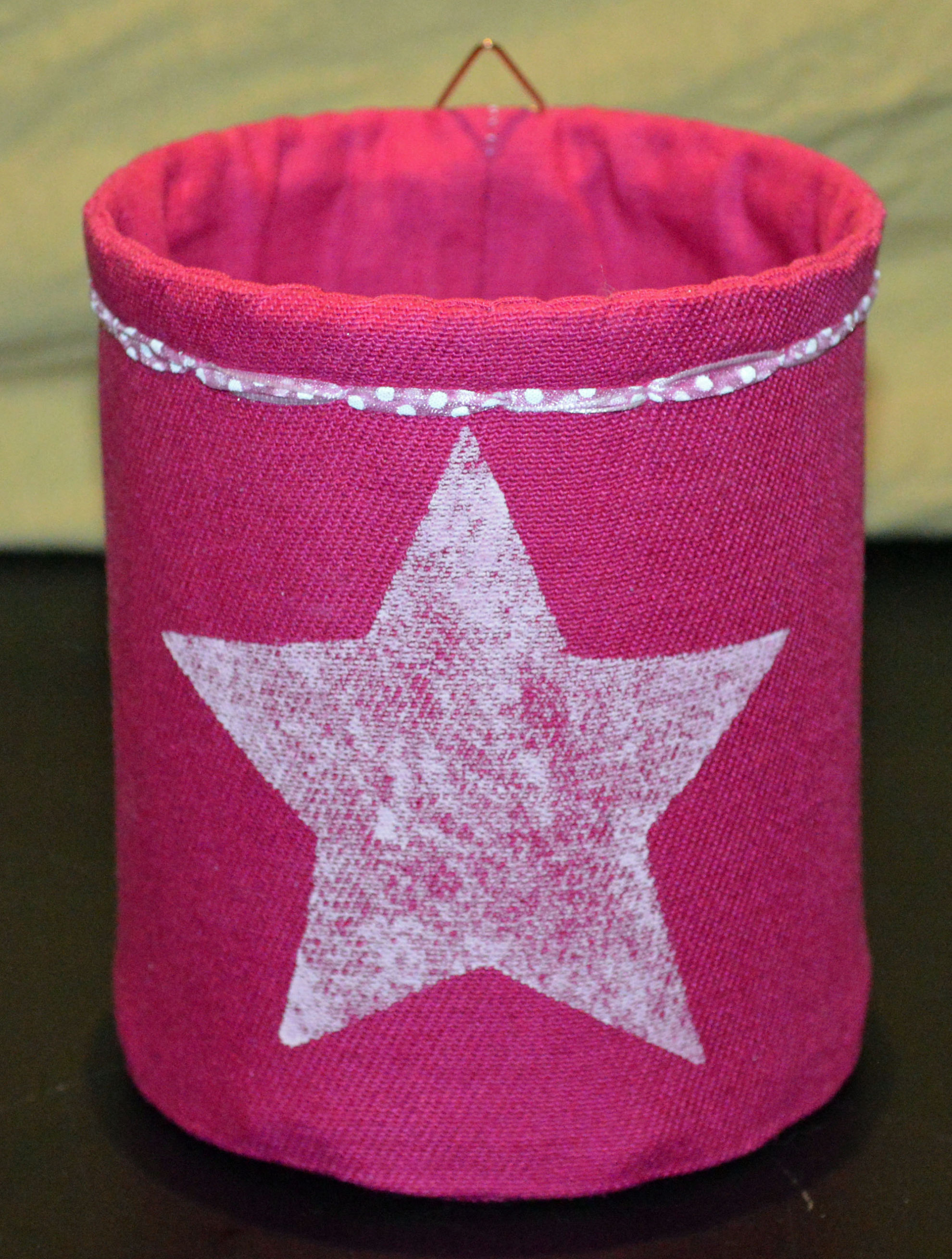 Material: Stoff Pink, Aludose, Motiv selber gestaltet "Stern", Bilderösen, Band, Bauernmalfarbe,
