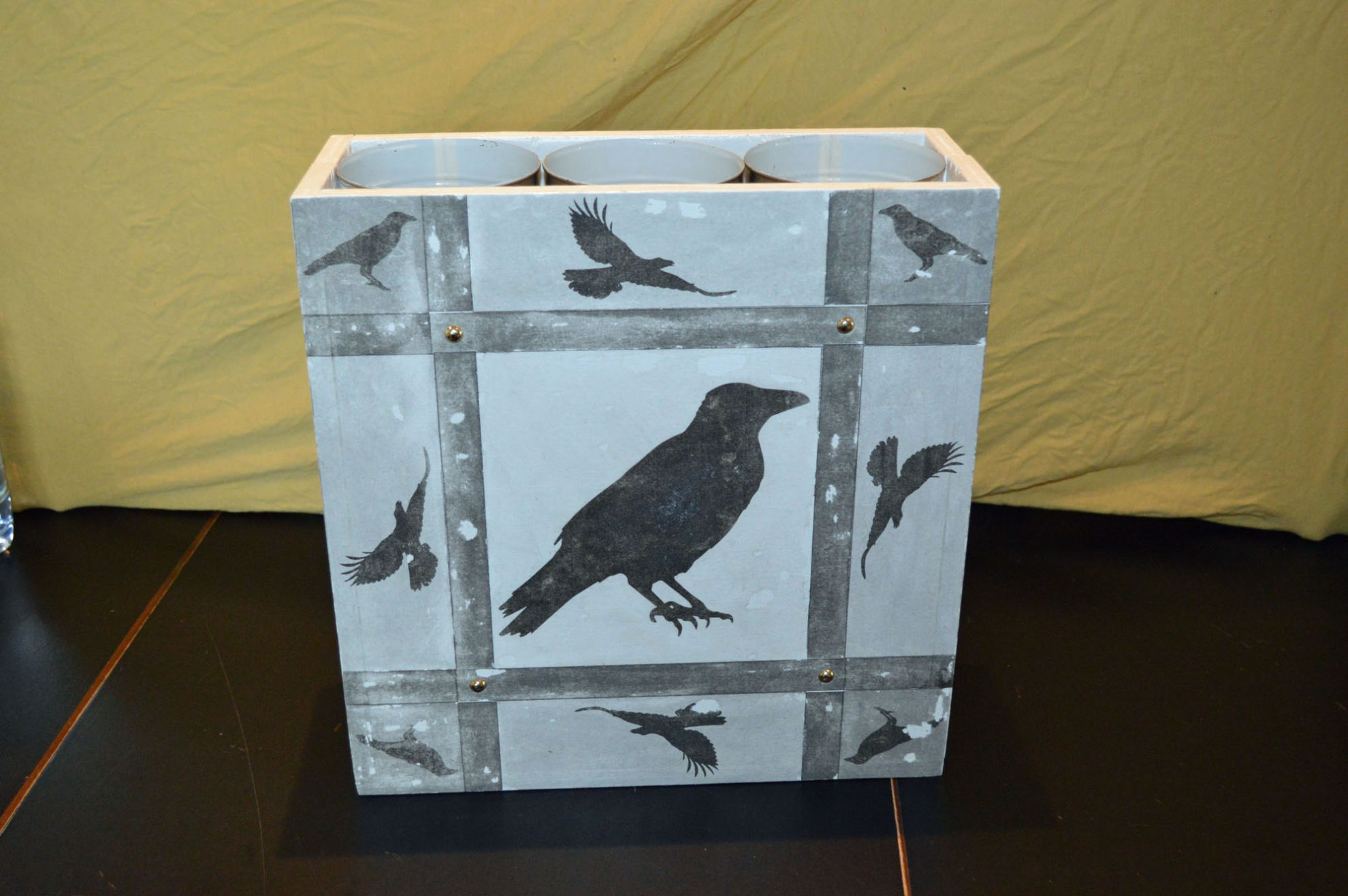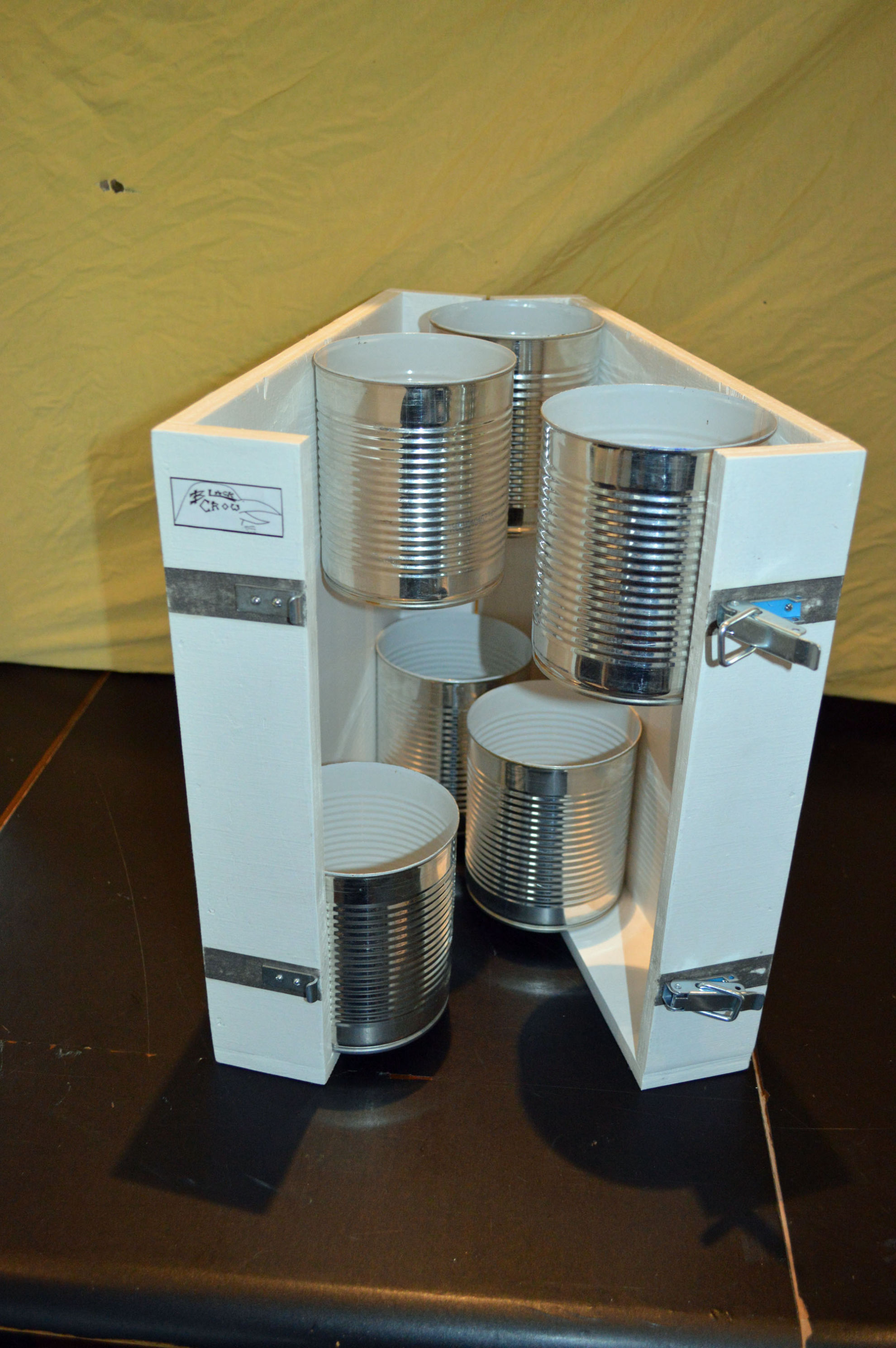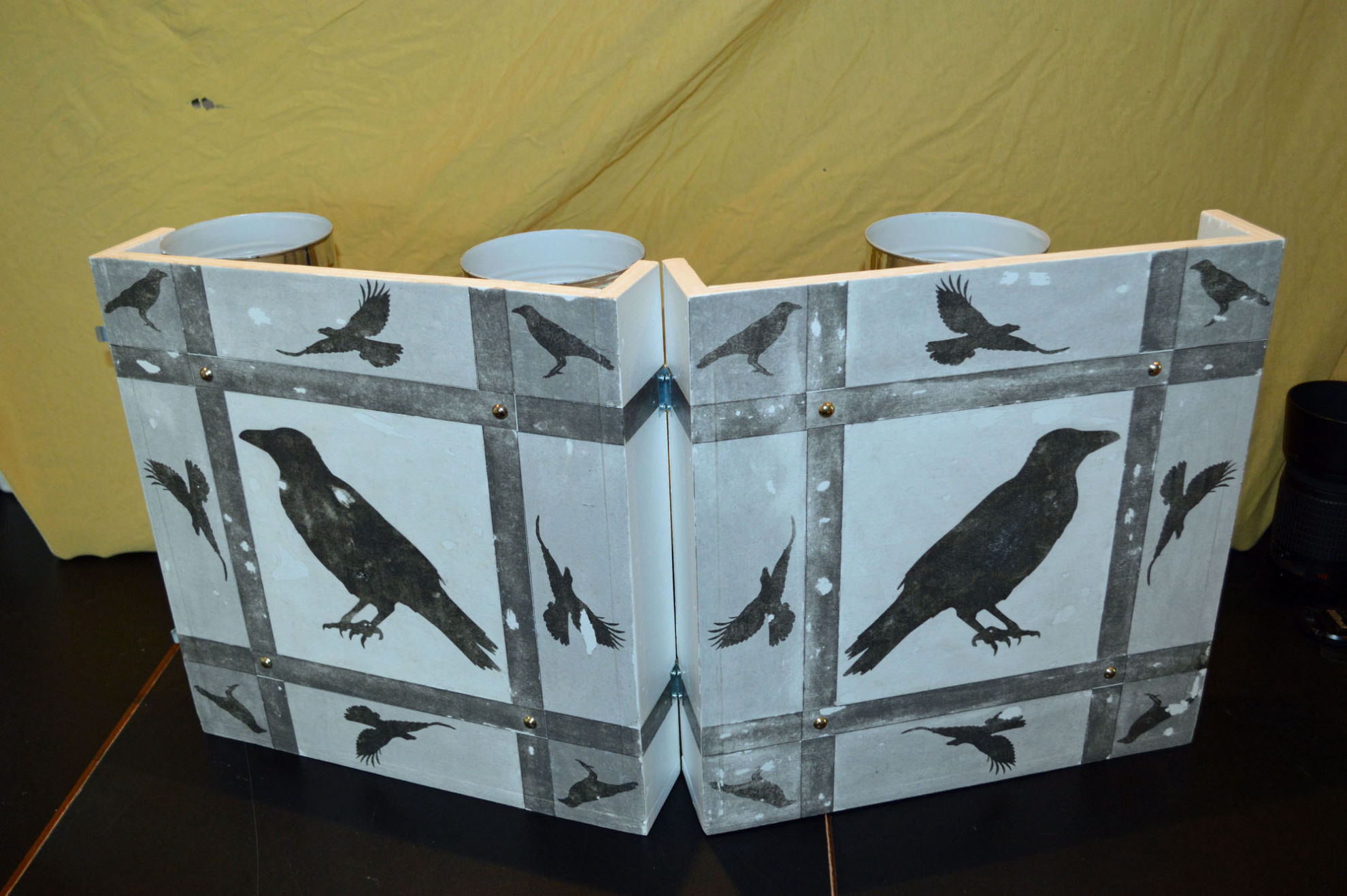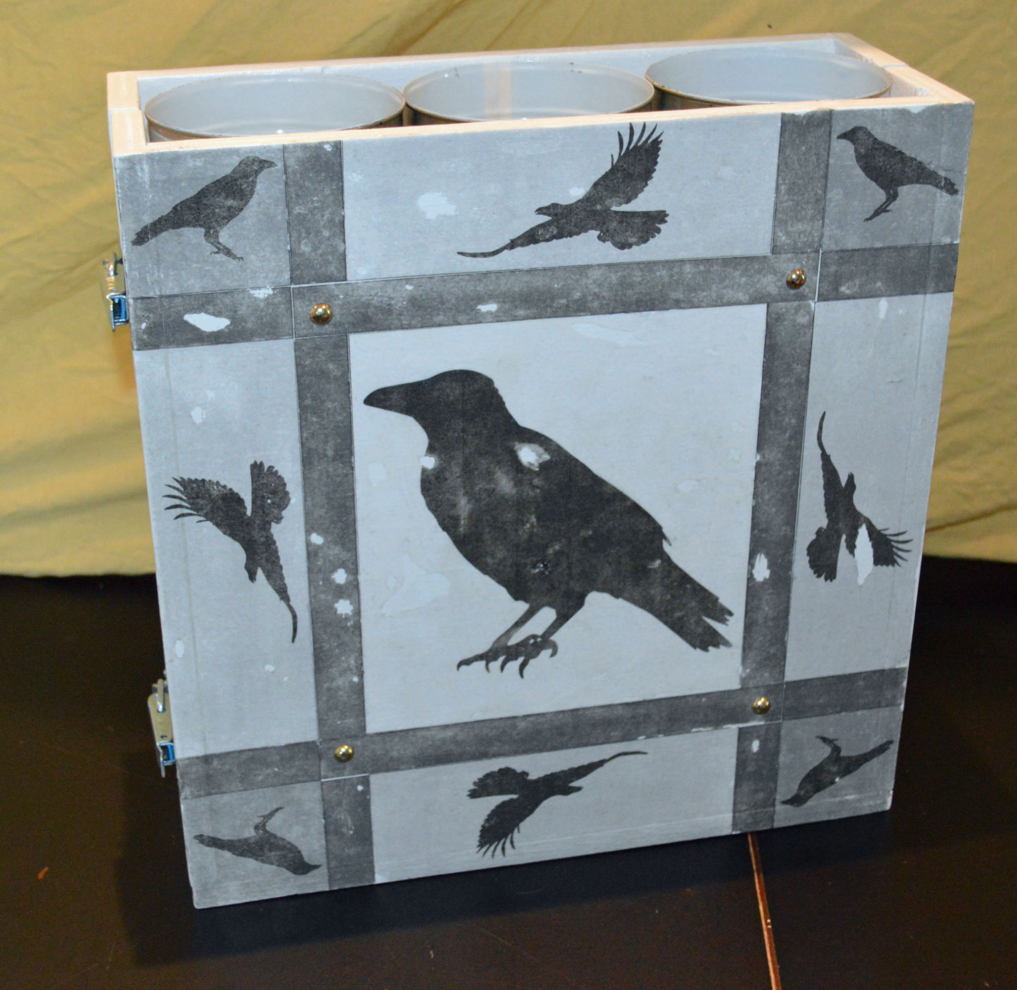 Material: Sperrholz (Spanplatte), Muster Krähe (selbst gestaltet aus Internetbildern), Aludosen, Scharniere, Polsternagel, Spannverschluss