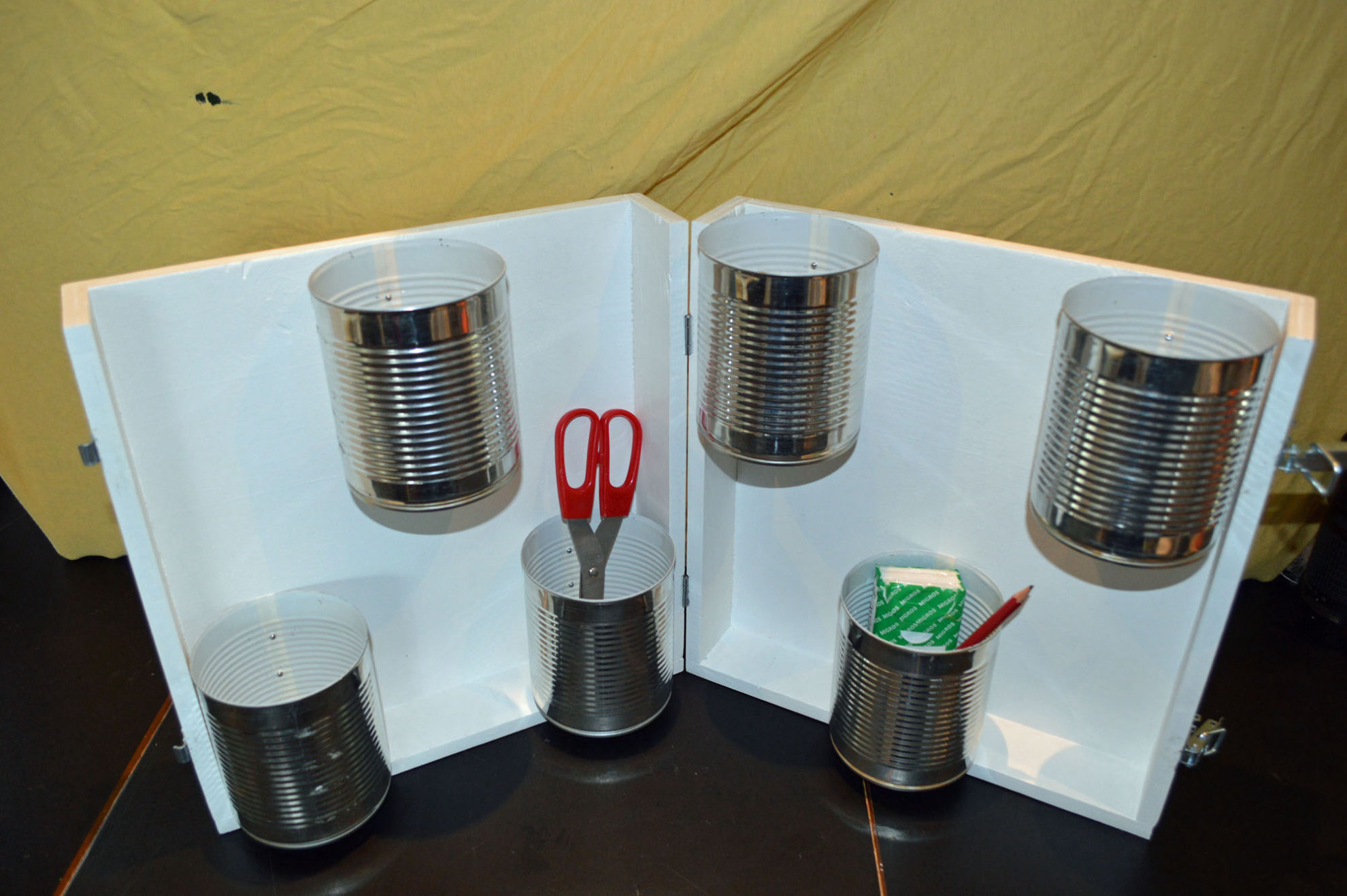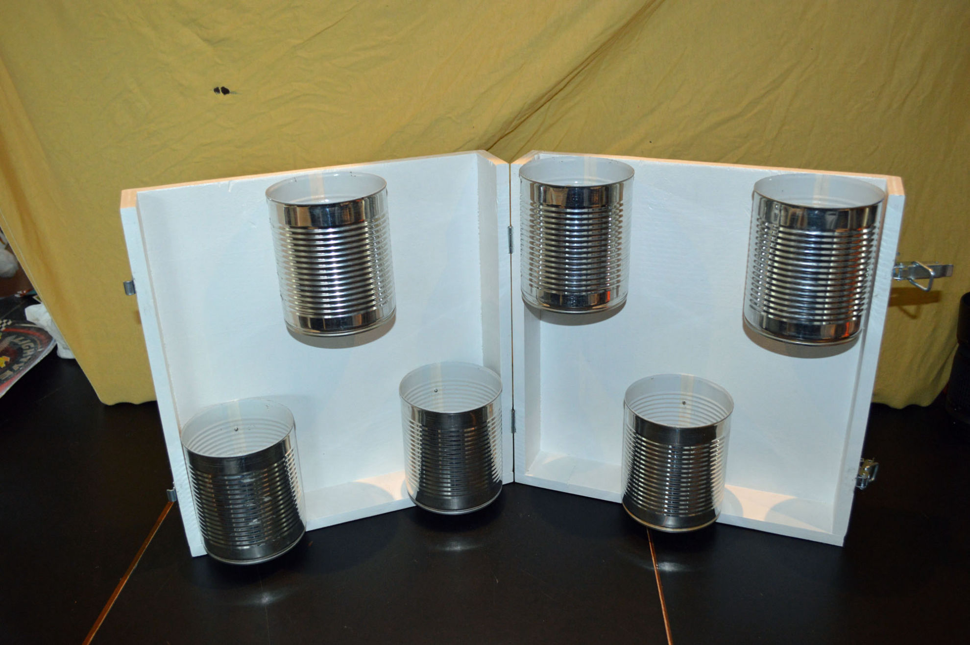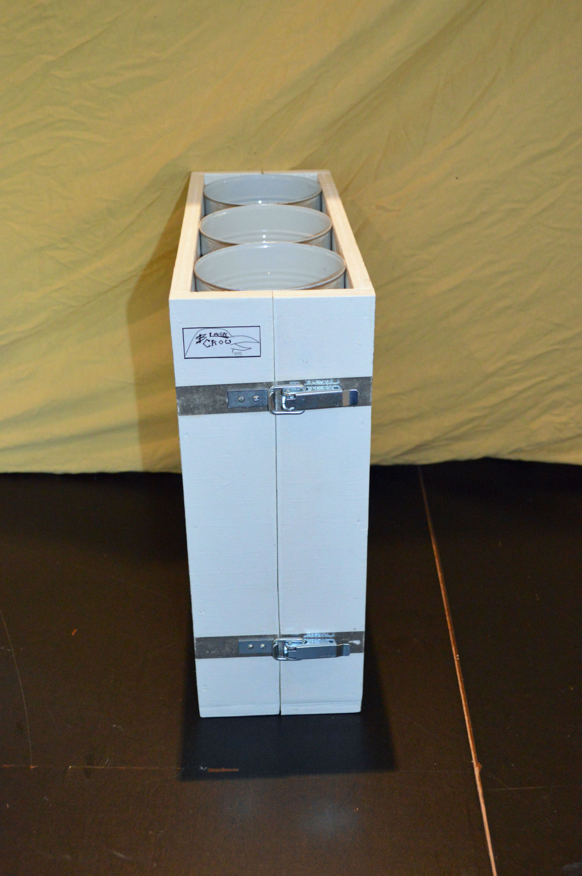 Material: Sperrholz (Spanplatte), Muster Krähe (selbst gestaltet aus Internetbildern), Aludosen, Scharniere, Polsternagel, Spannverschluss