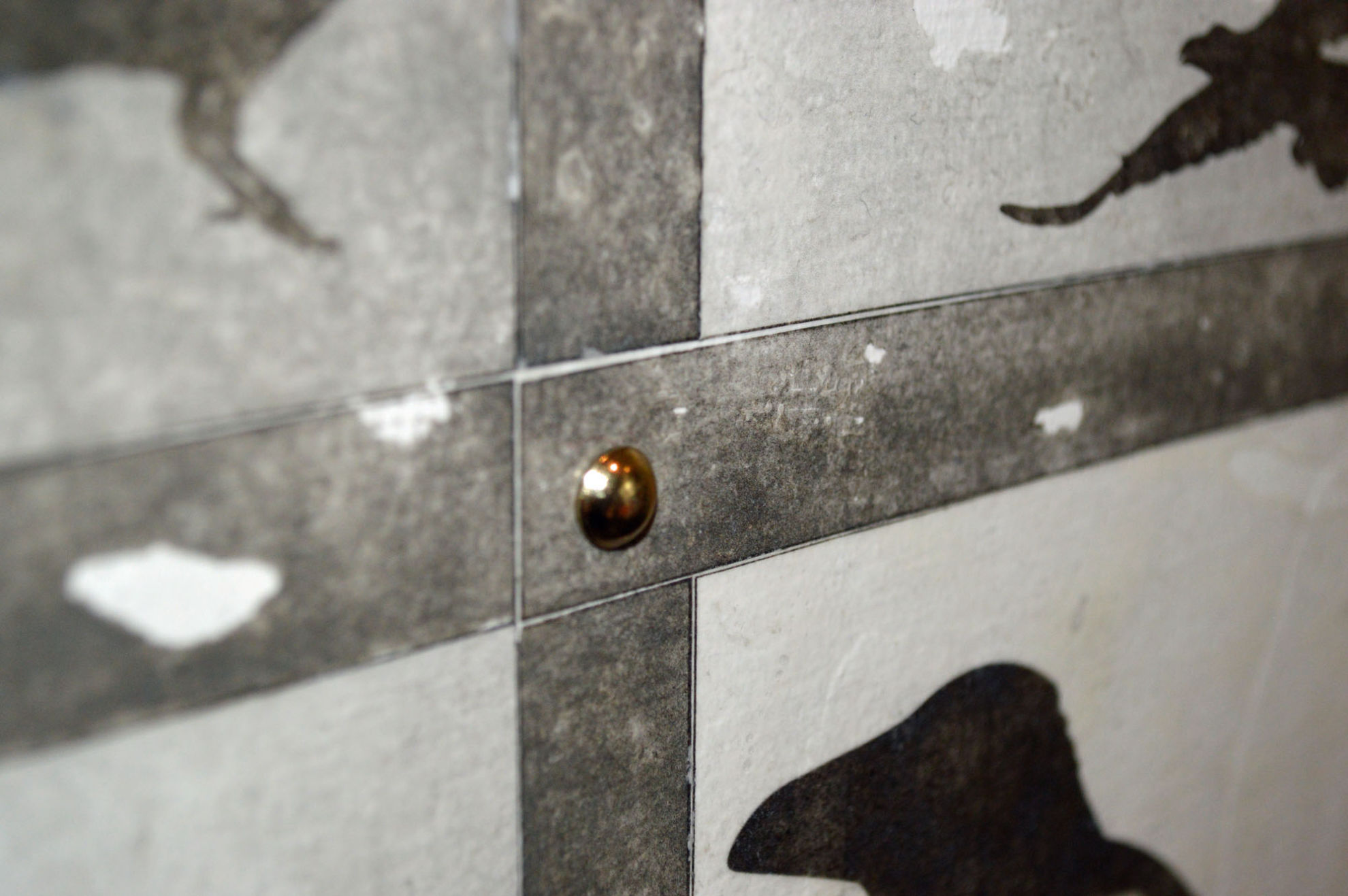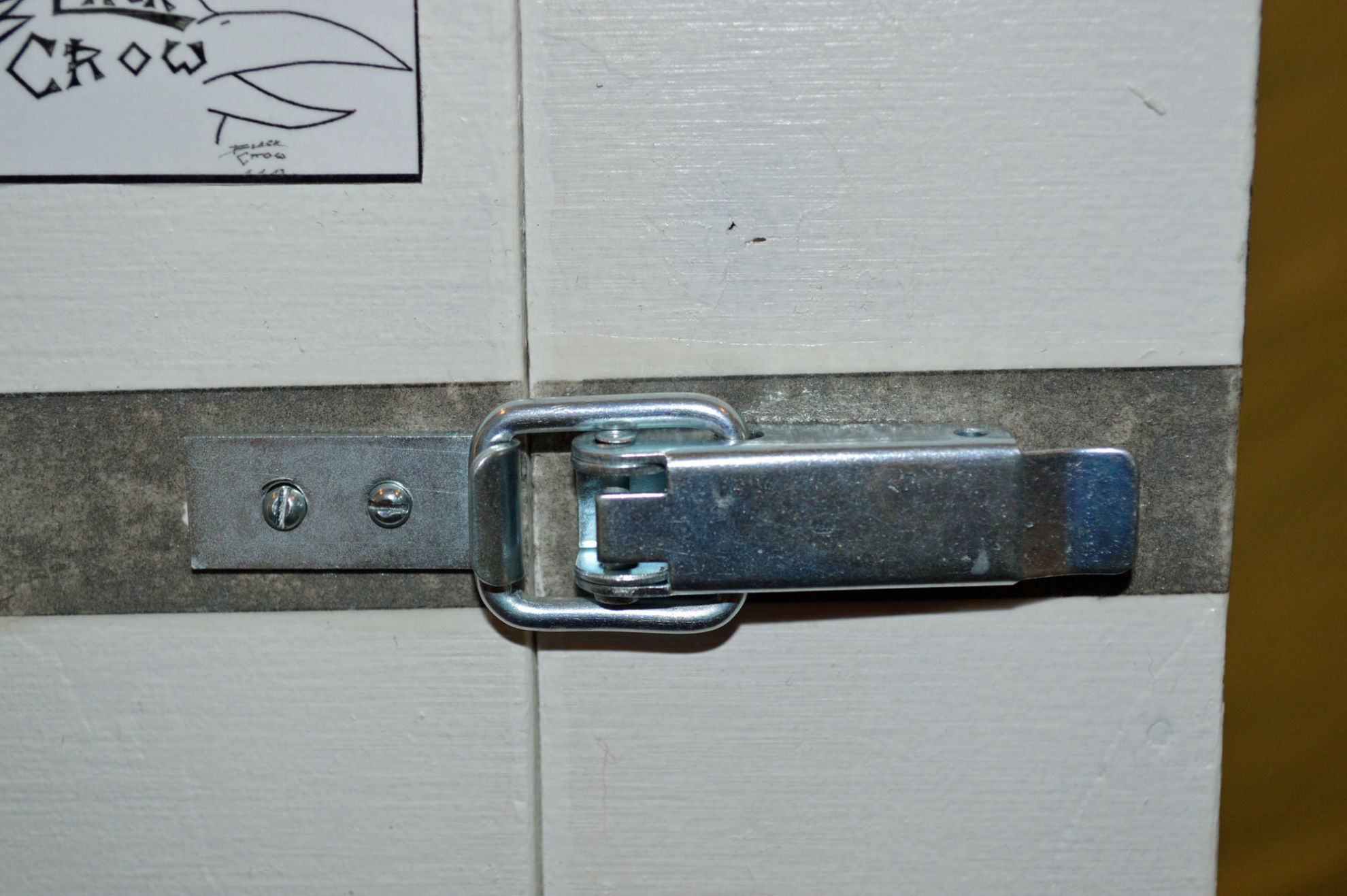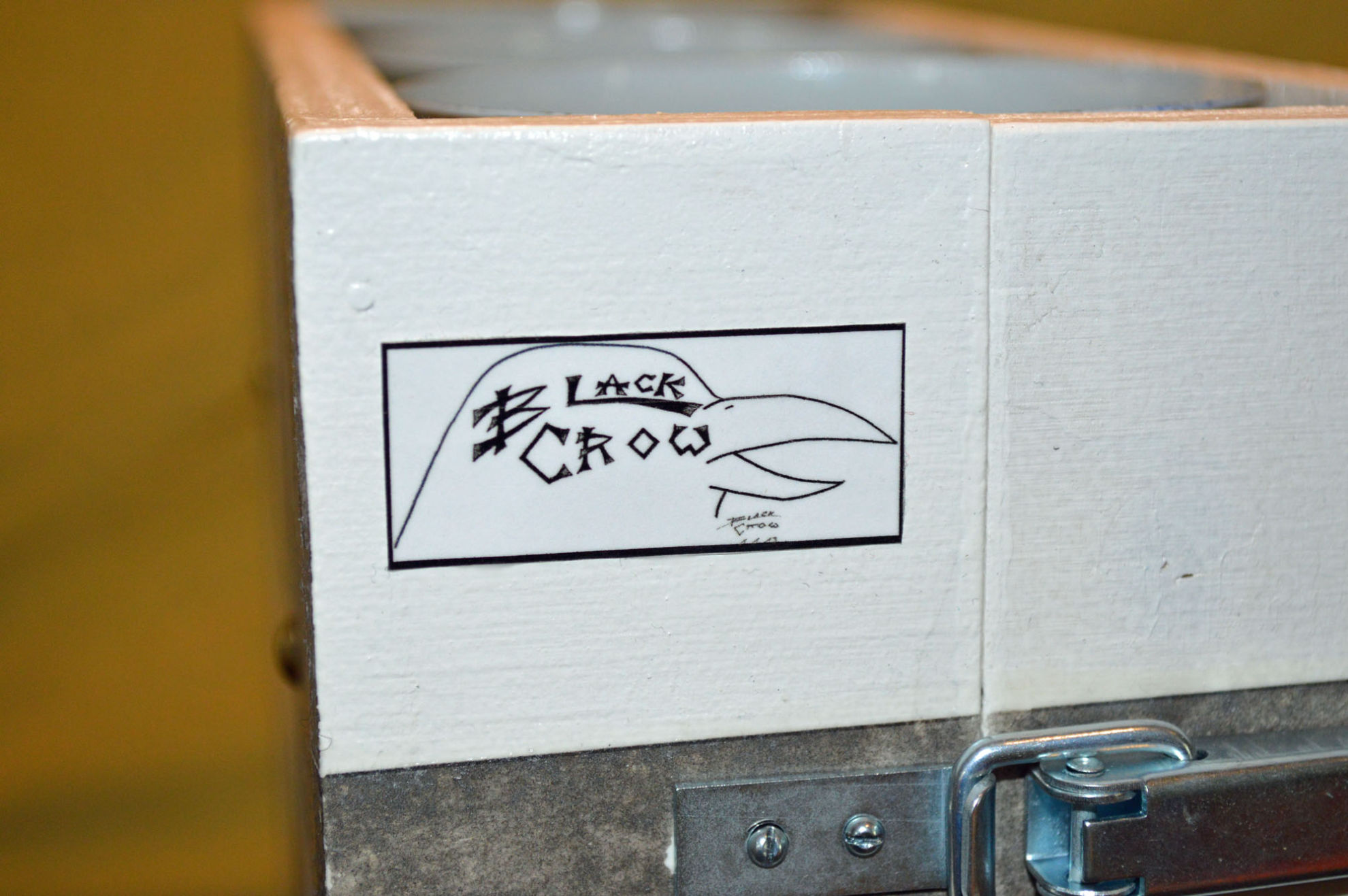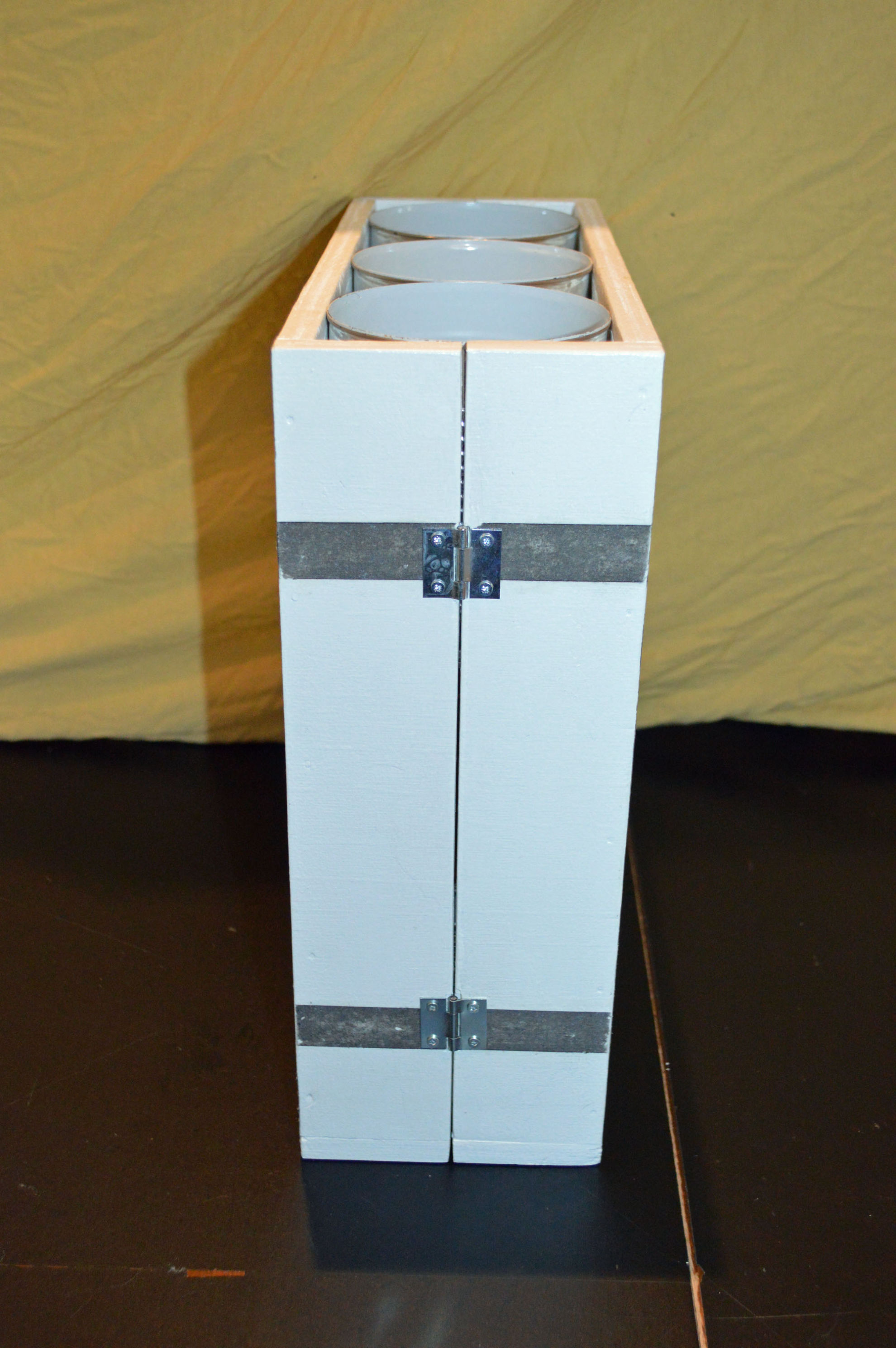 Material: Sperrholz (Spanplatte), Muster Krähe (selbst gestaltet aus Internetbildern), Aludosen, Scharniere, Polsternagel, Spannverschluss