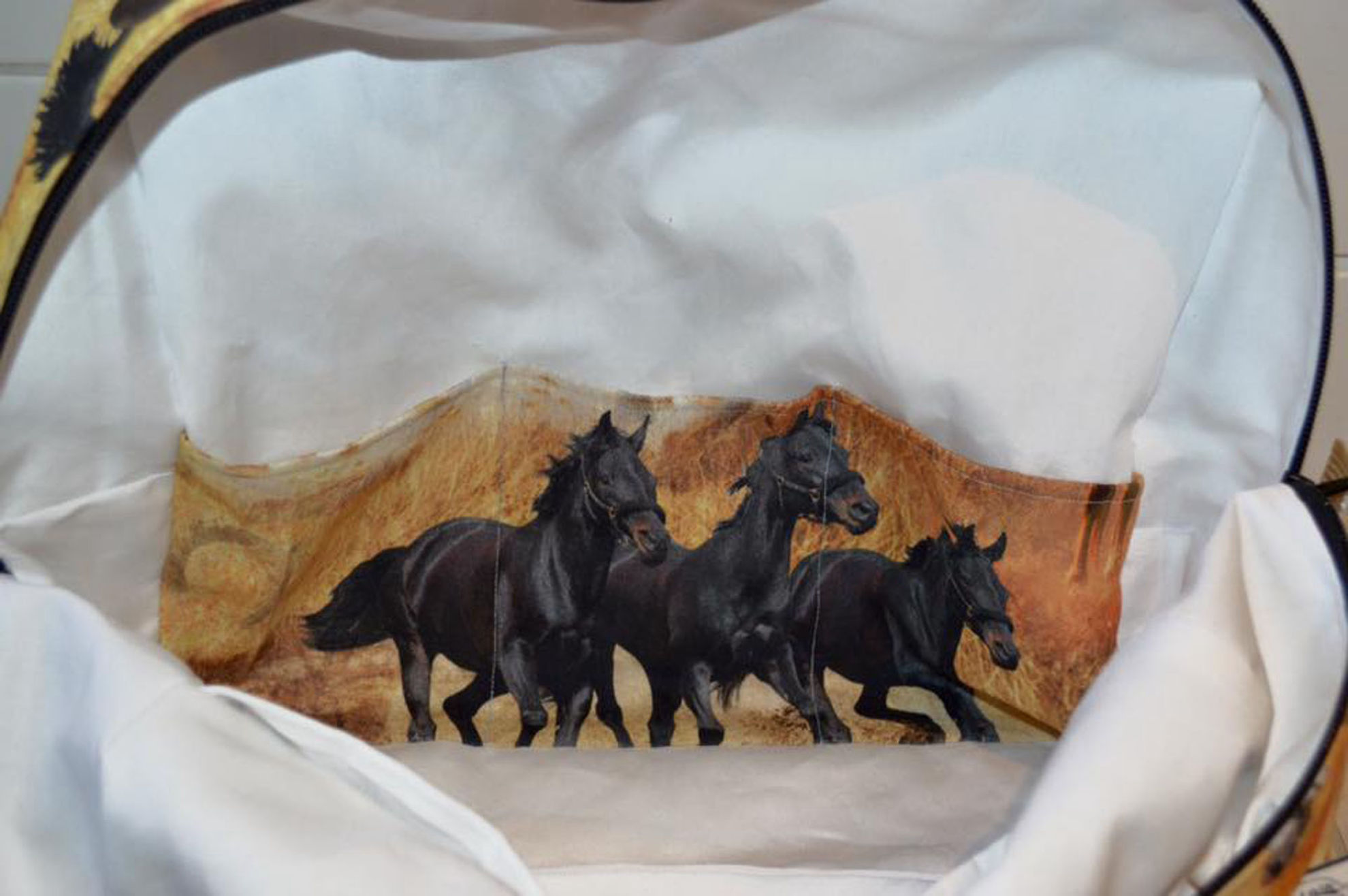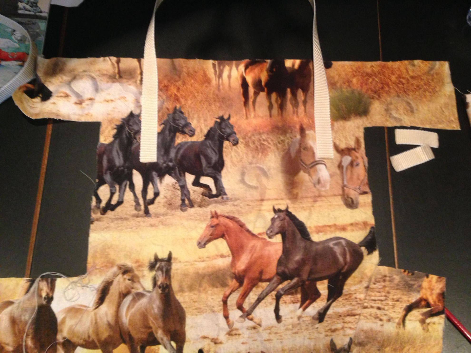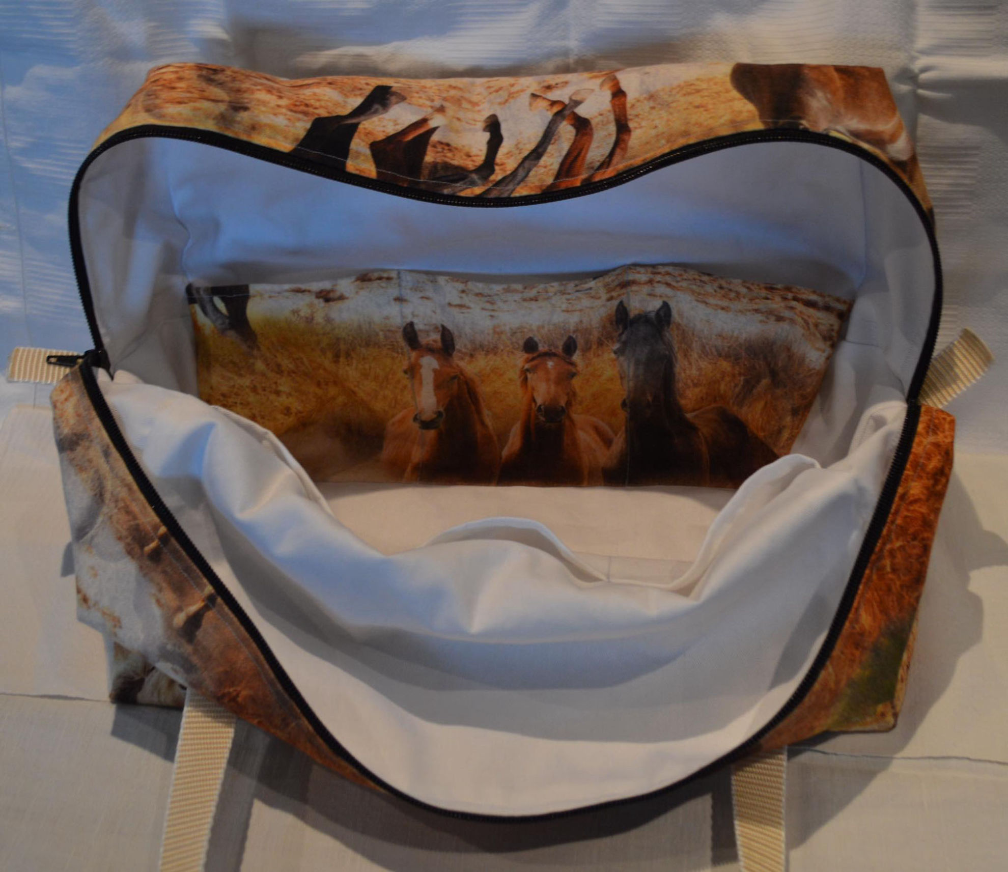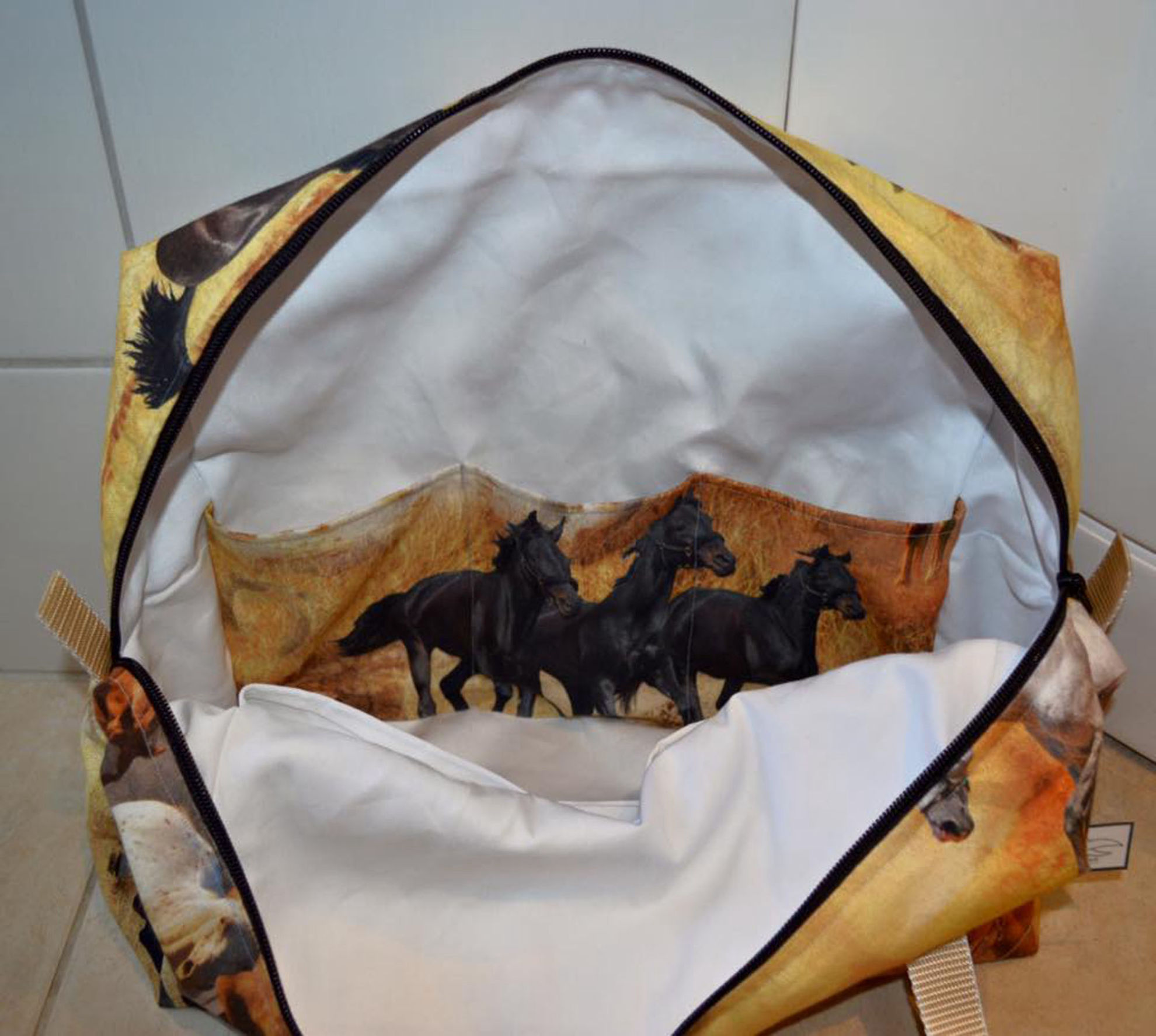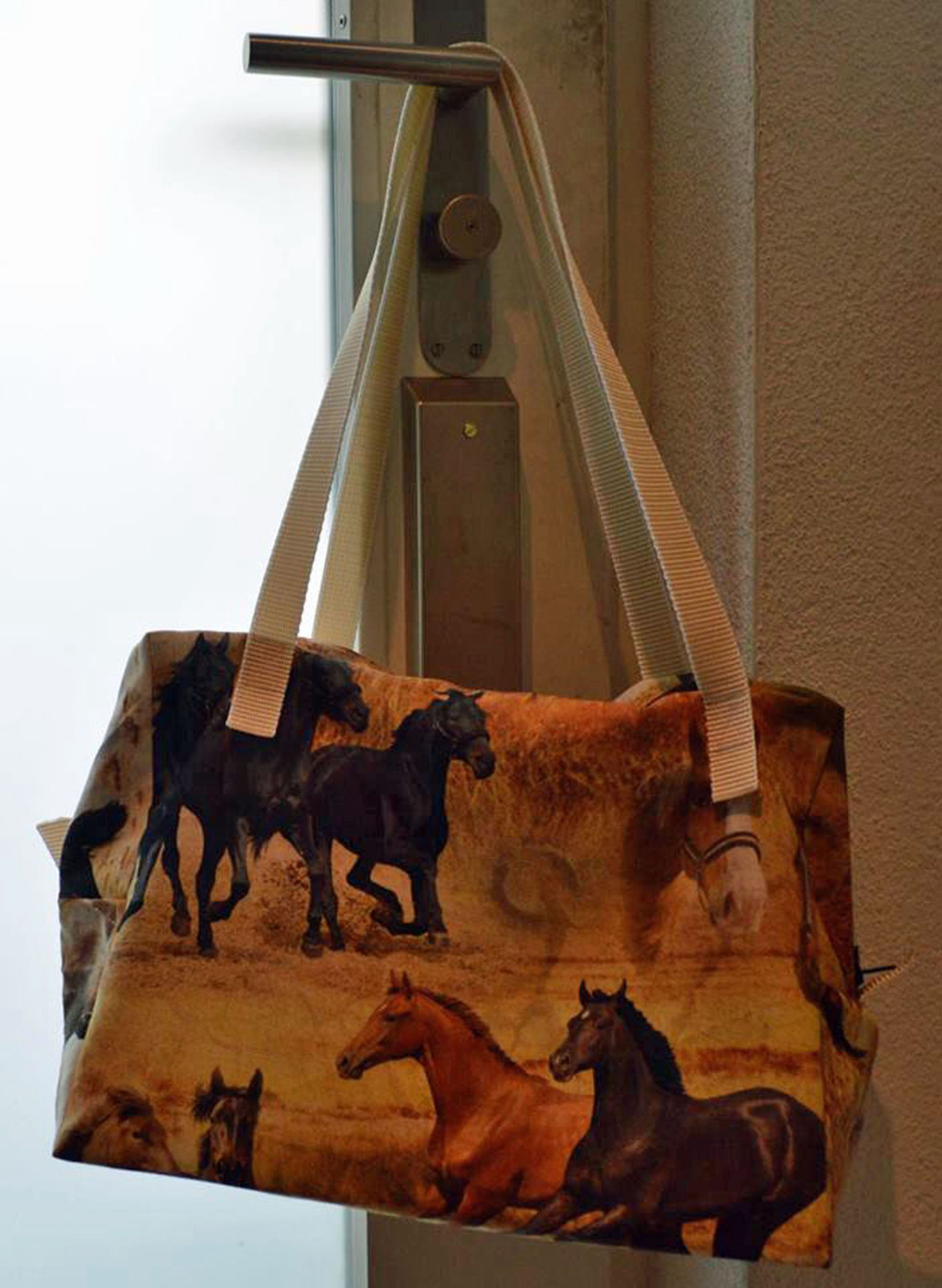 Material: Stoff Motiv "Pferde", Reissverschluss, Rollladengurt, Plexiglas (Bodenverstärkung)