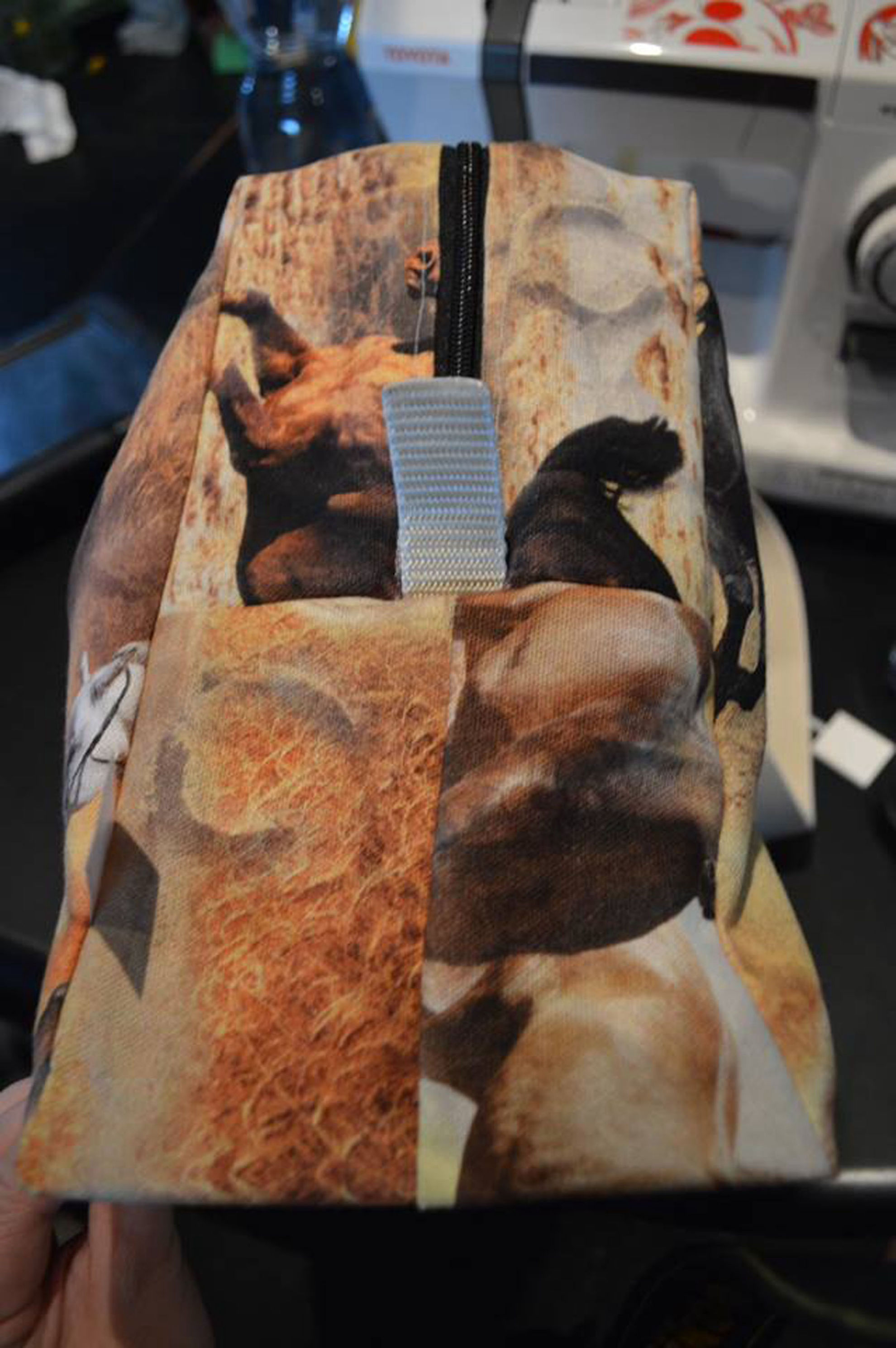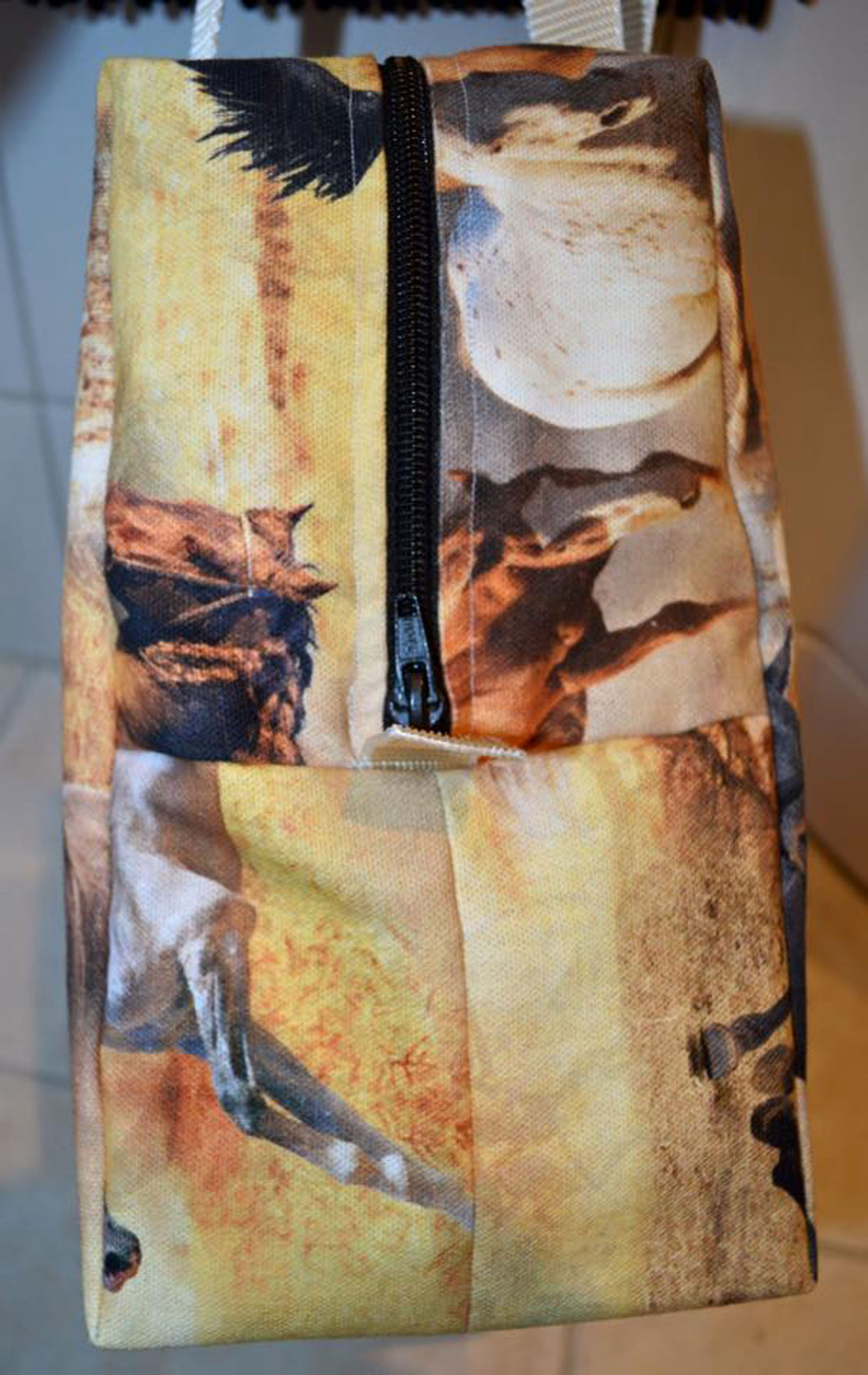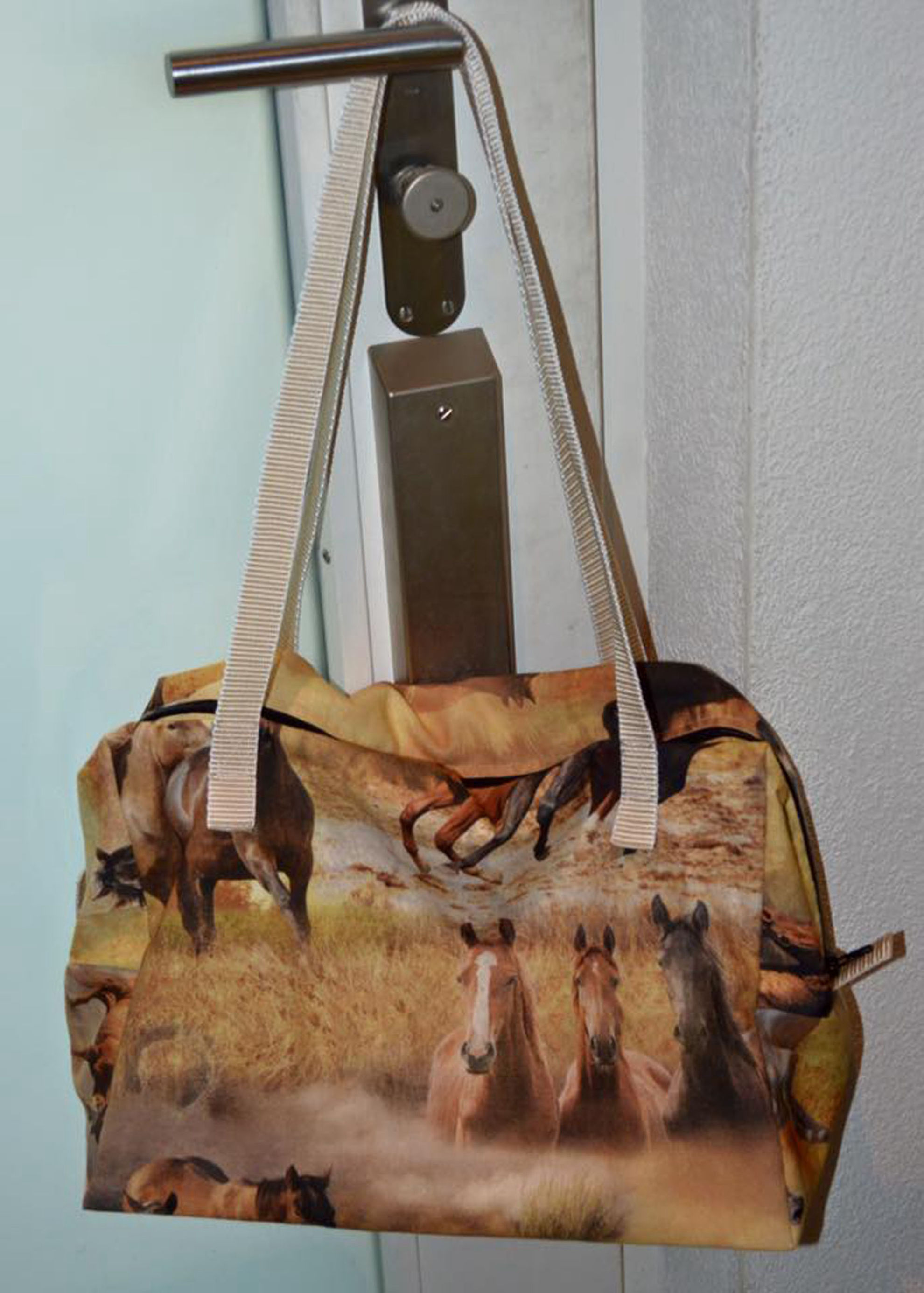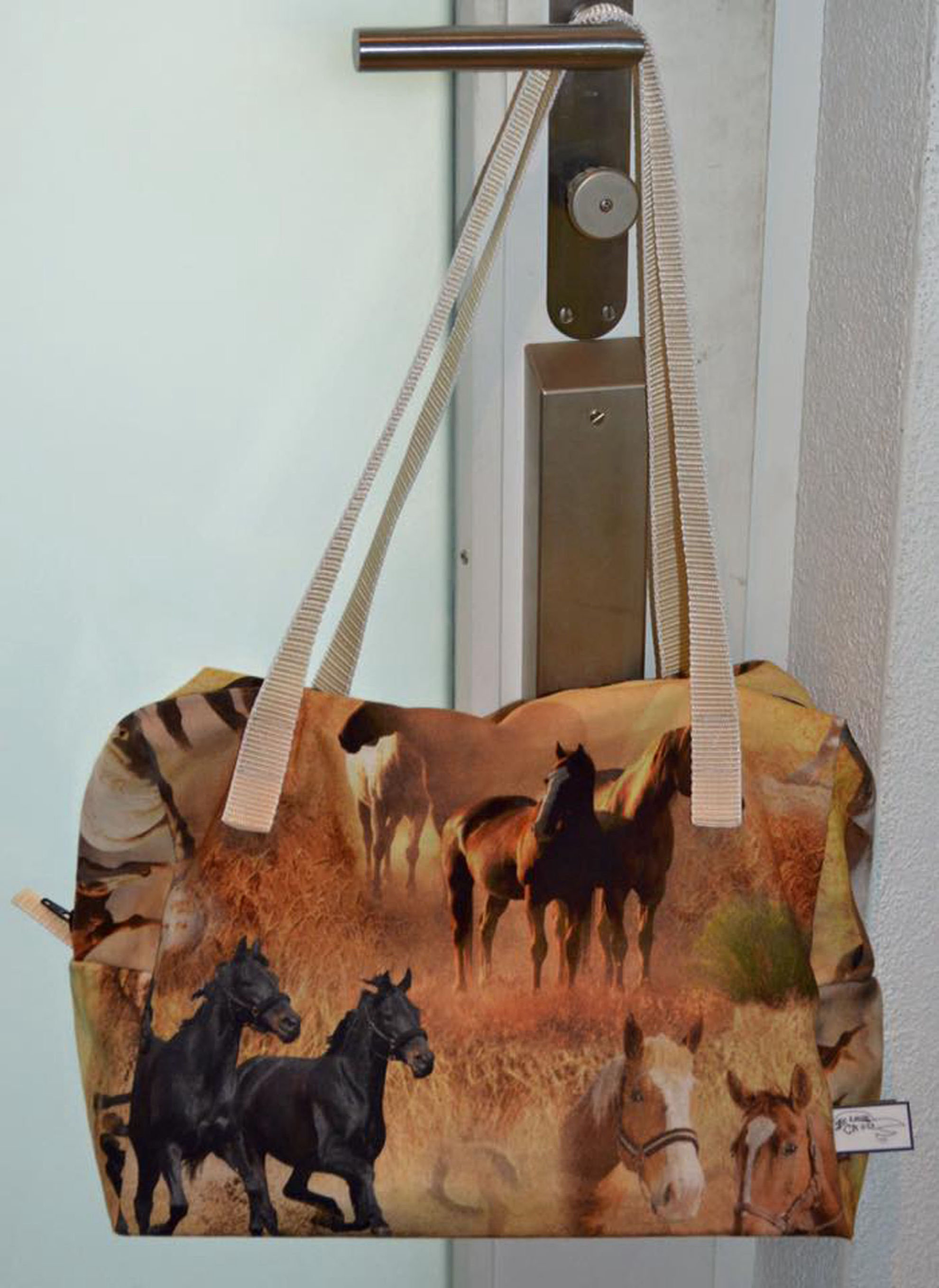 Material: Stoff Motiv "Pferde", Reissverschluss, Rollladengurt, Plexiglas (Bodenverstärkung)