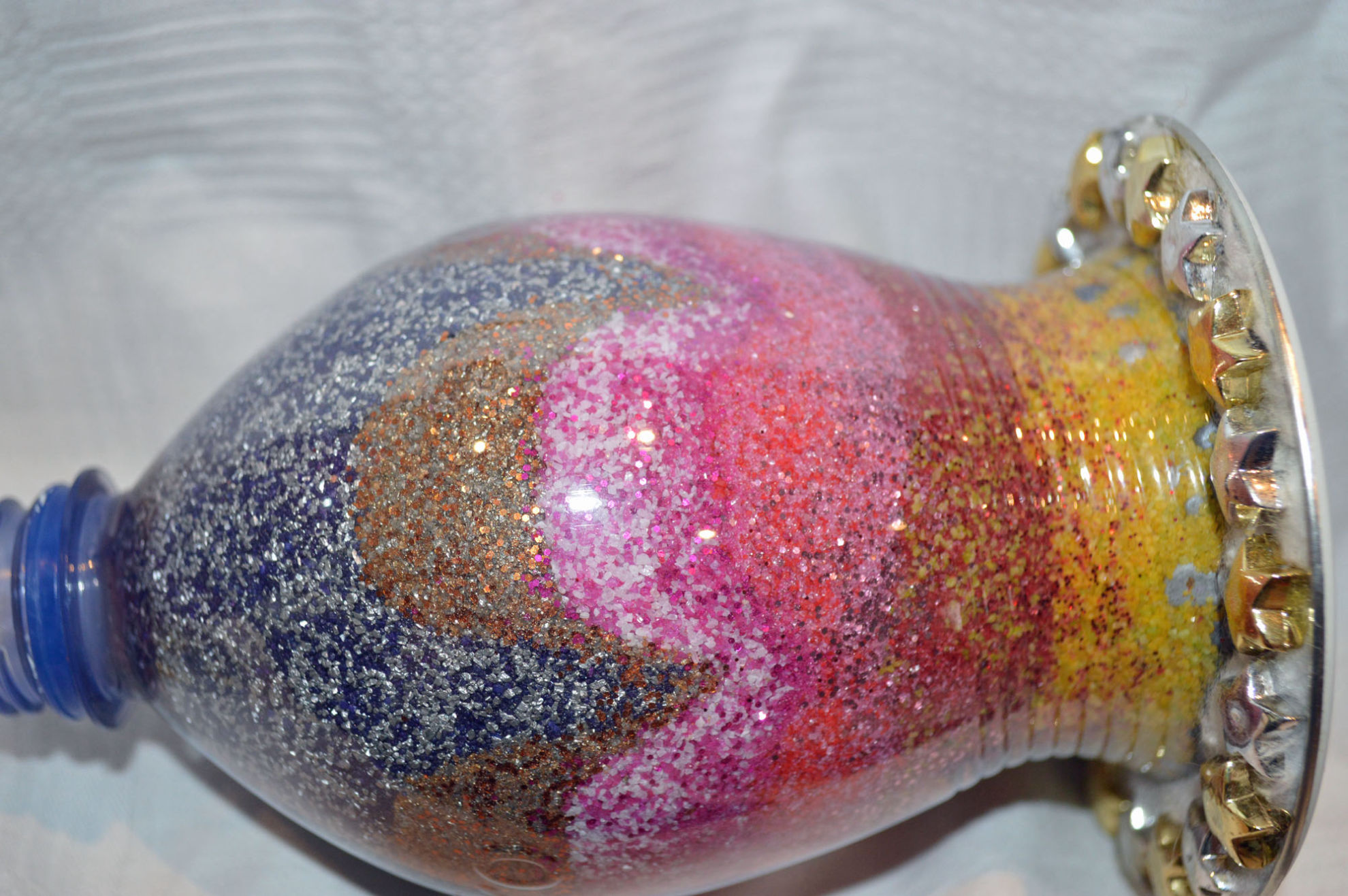 Material: PET Flasche 1.5l und Boden ist einem Alu                                            Dosendeckel, Gefüllt mit Buntem Dekor-Sand.                                  Dekosterne, Watte