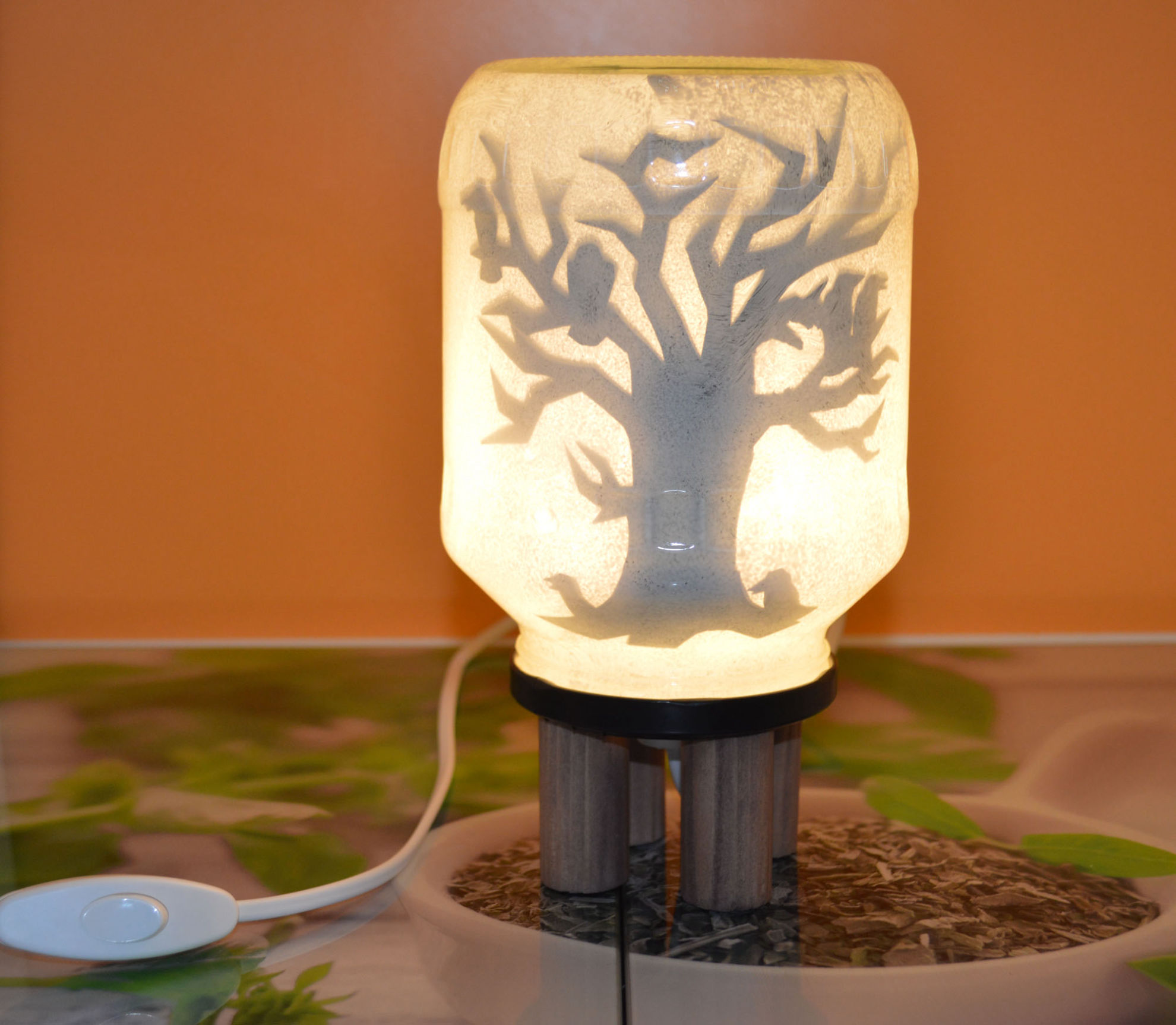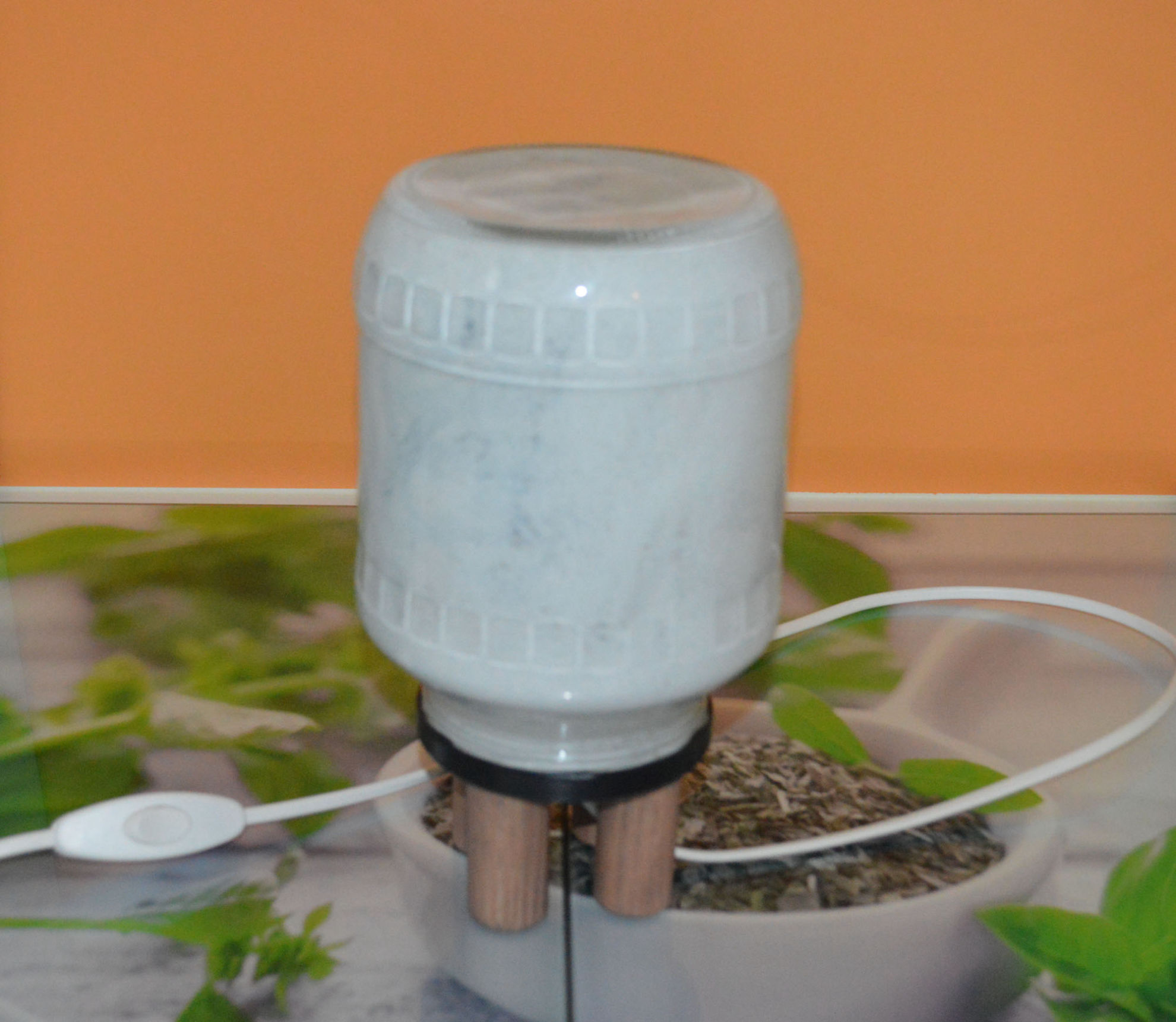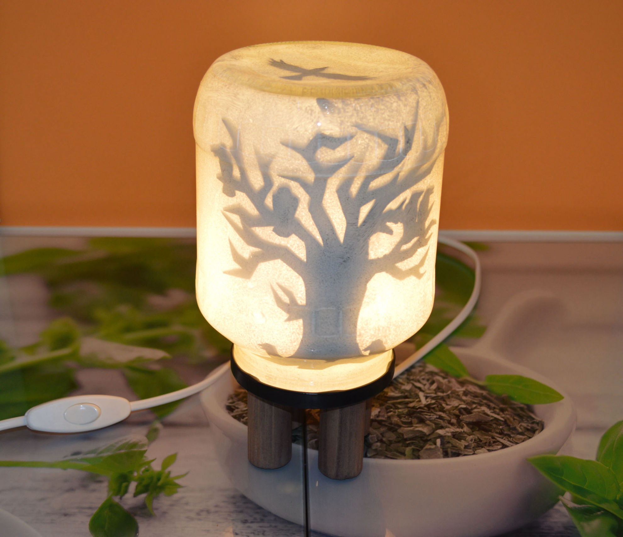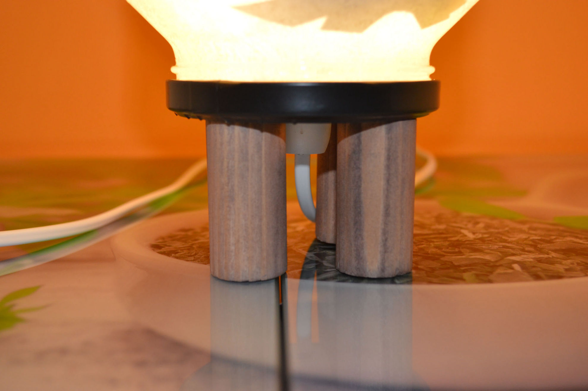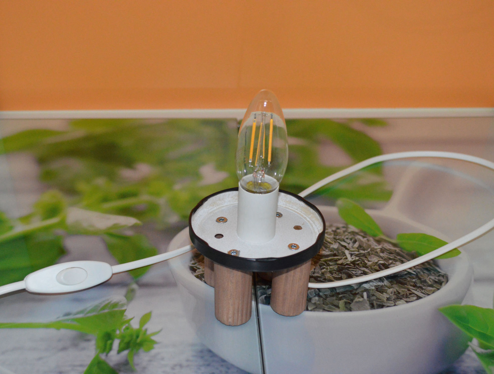 Material: Gurkenglas, Netzkabel mit Stecker C (Euro Stecker), Fassung E14, LED Glühbirne E14, Holz, Moosgummi