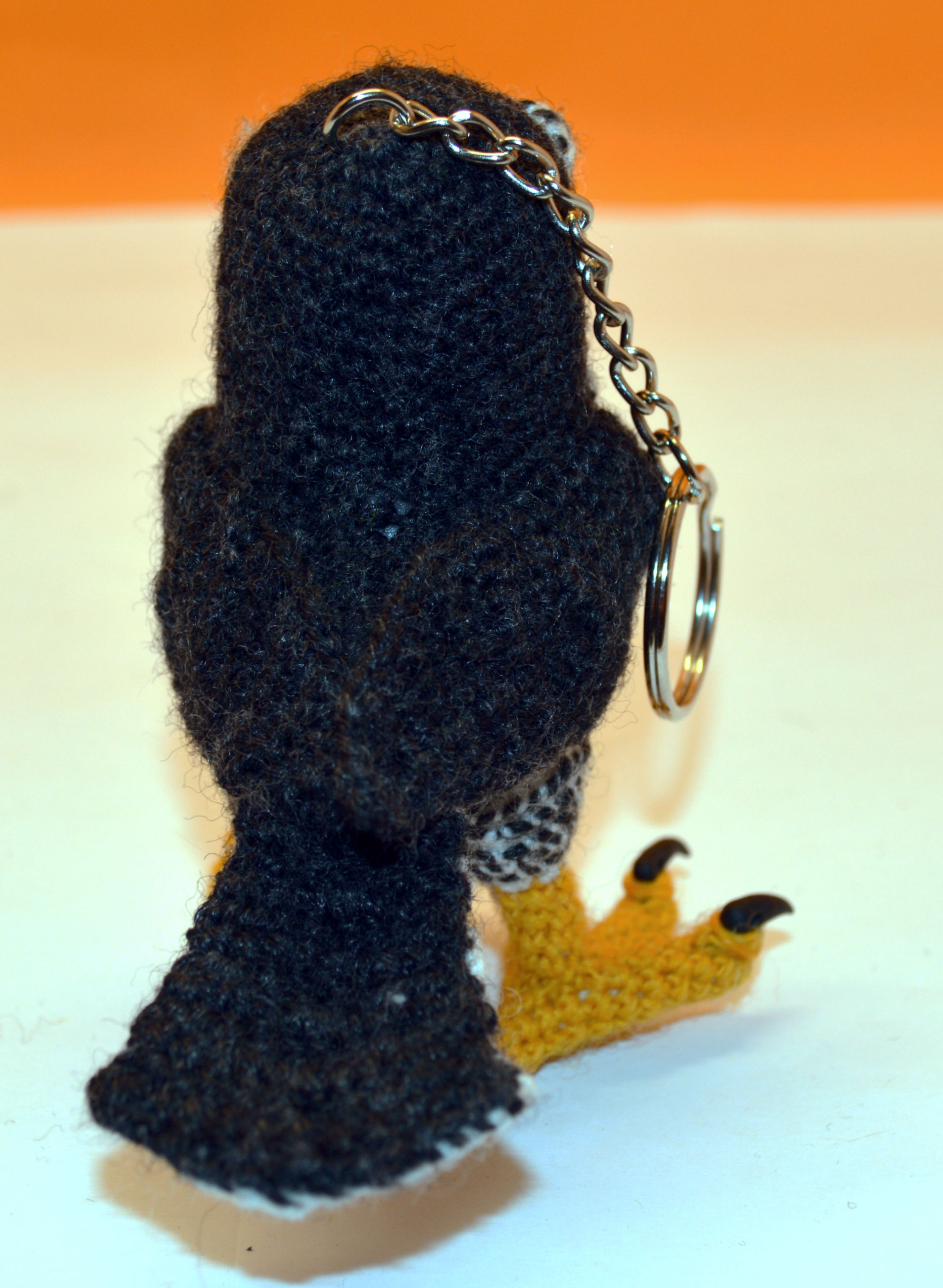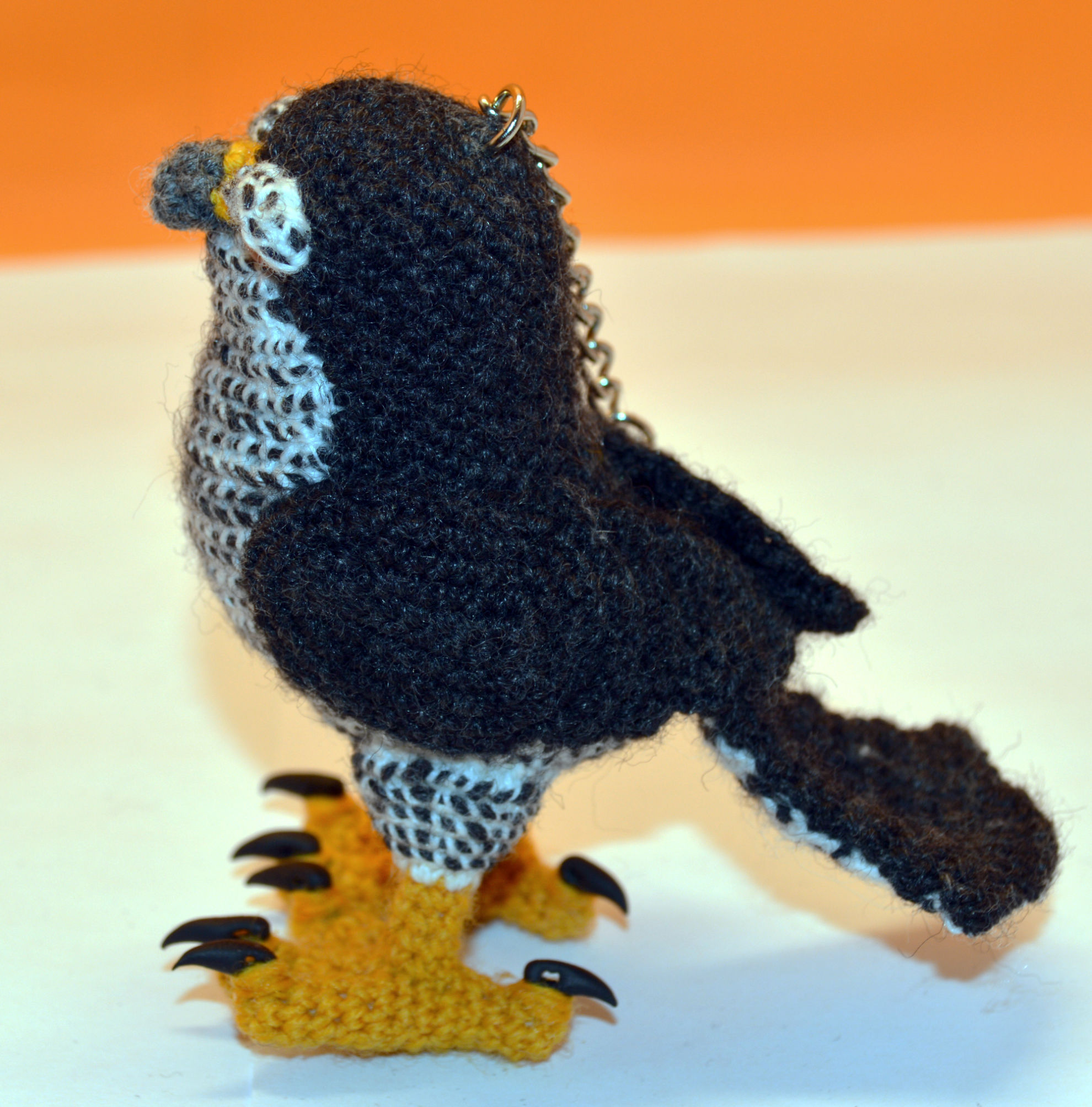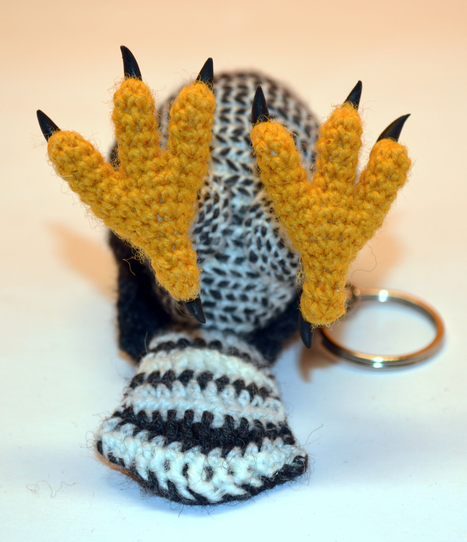 Material: Wolle Anthrazit, Goldgelb, Grau, Fimo Krallen, Glasaugen, Bastelwatte