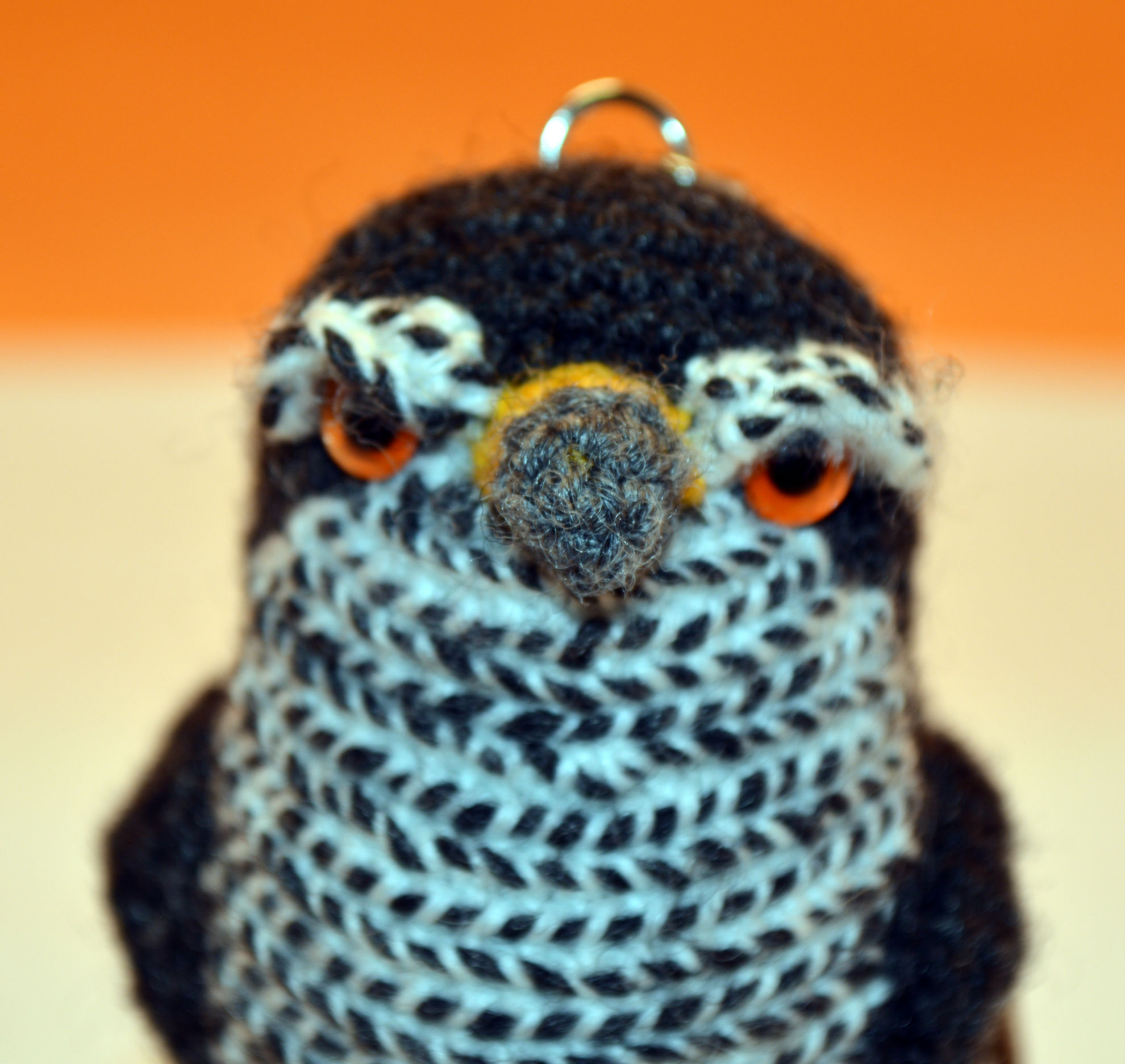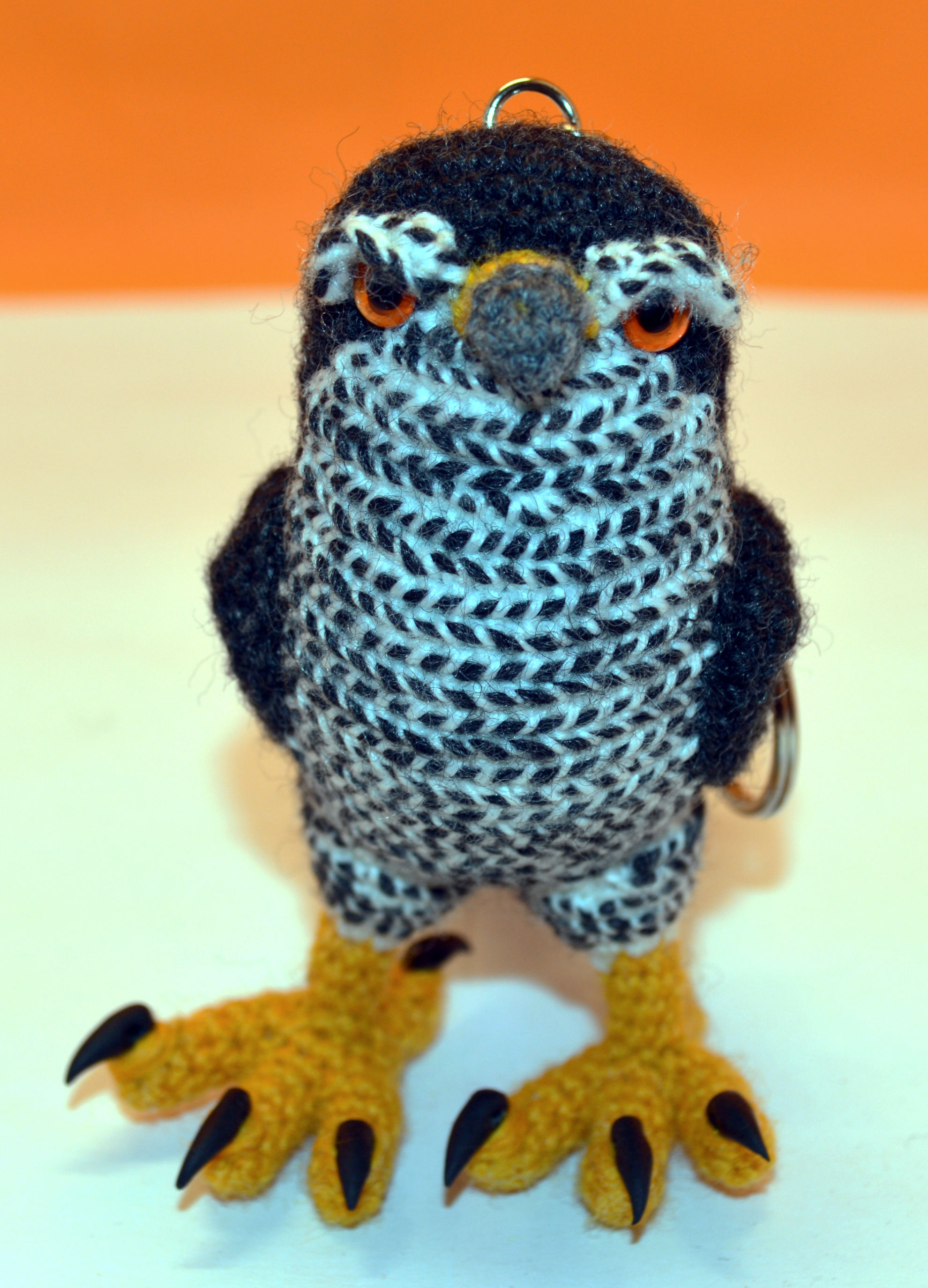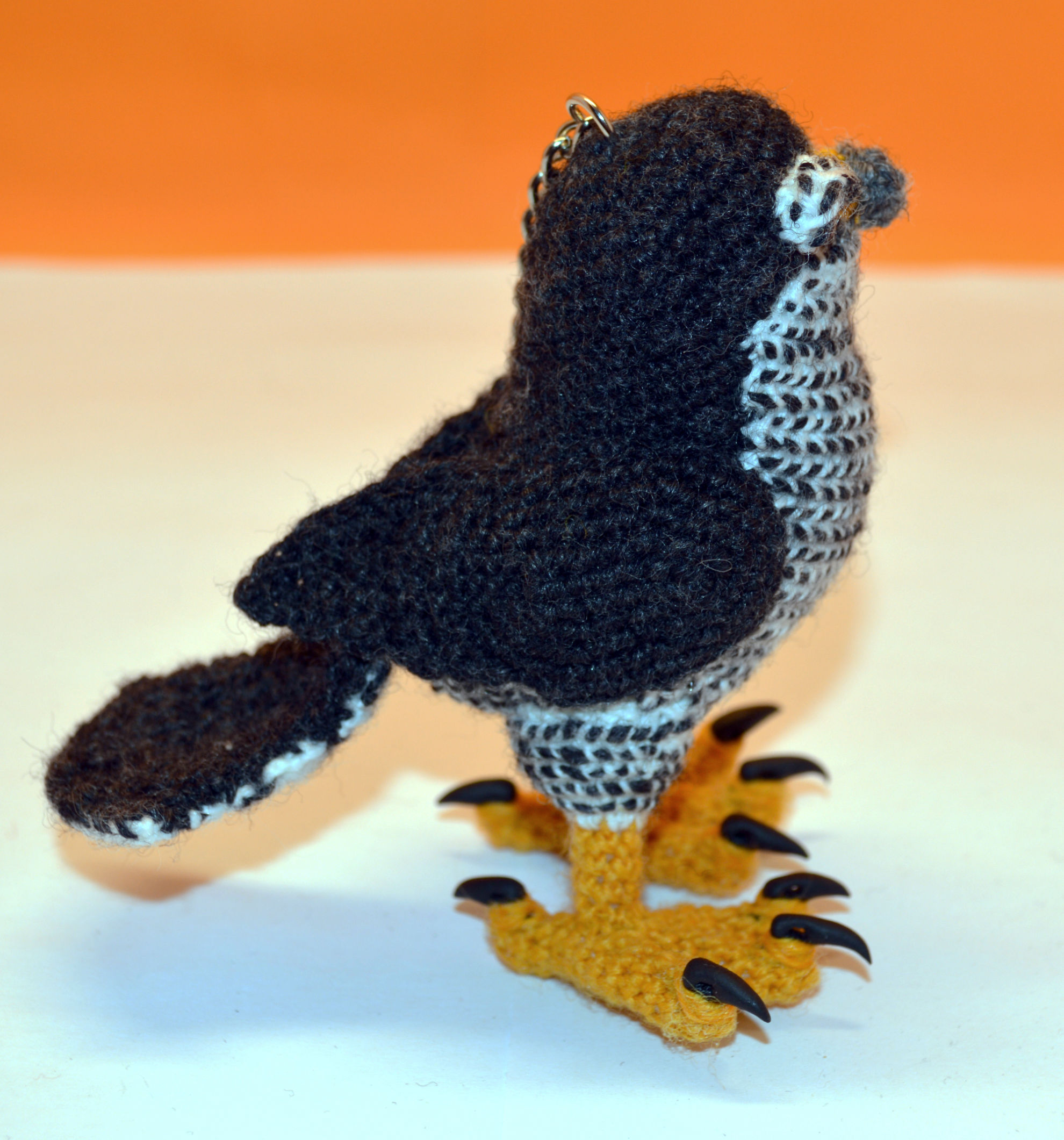 Material: Wolle Anthrazit, Goldgelb, Grau, Fimo Krallen, Glasaugen, Bastelwatte