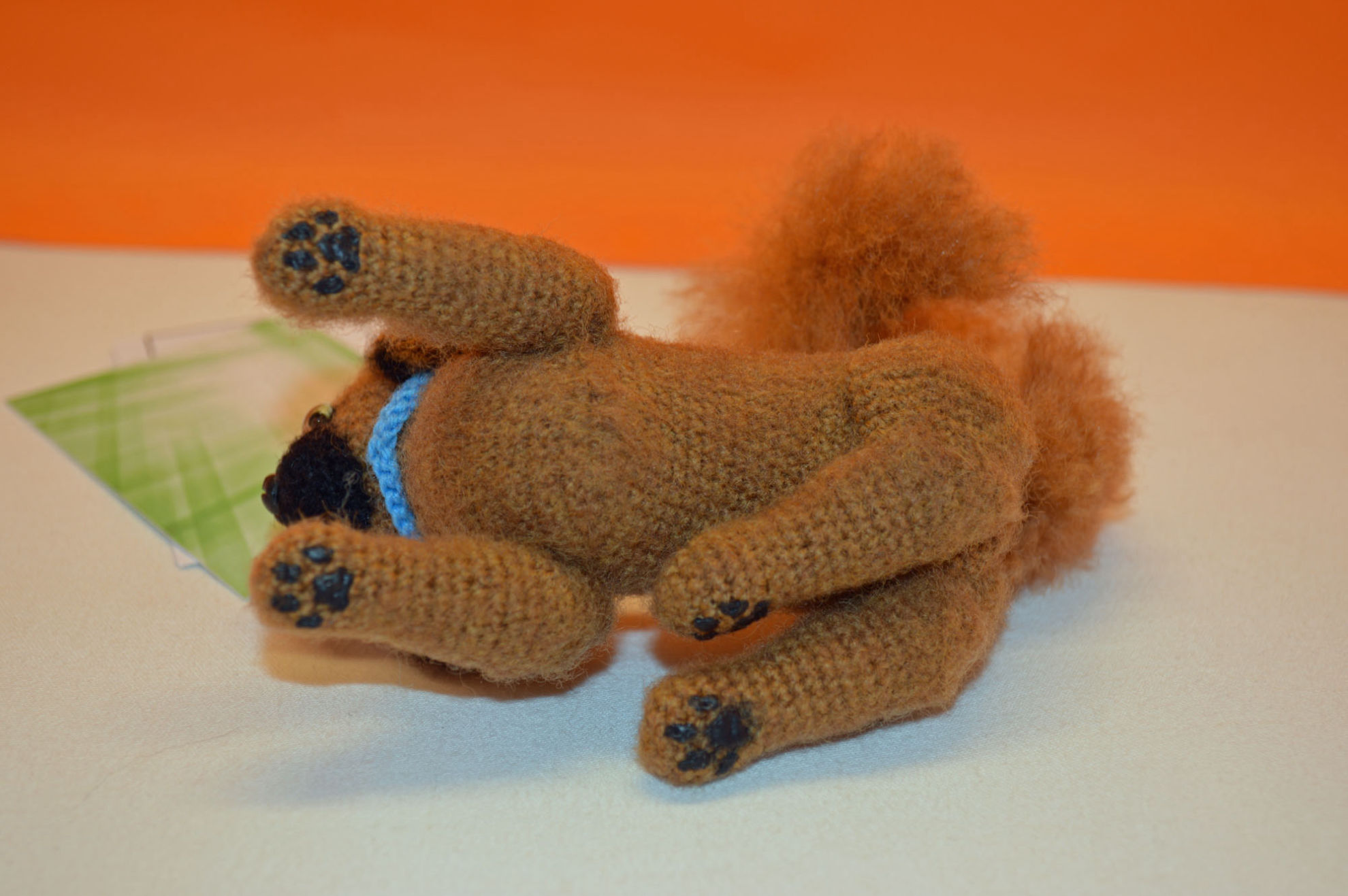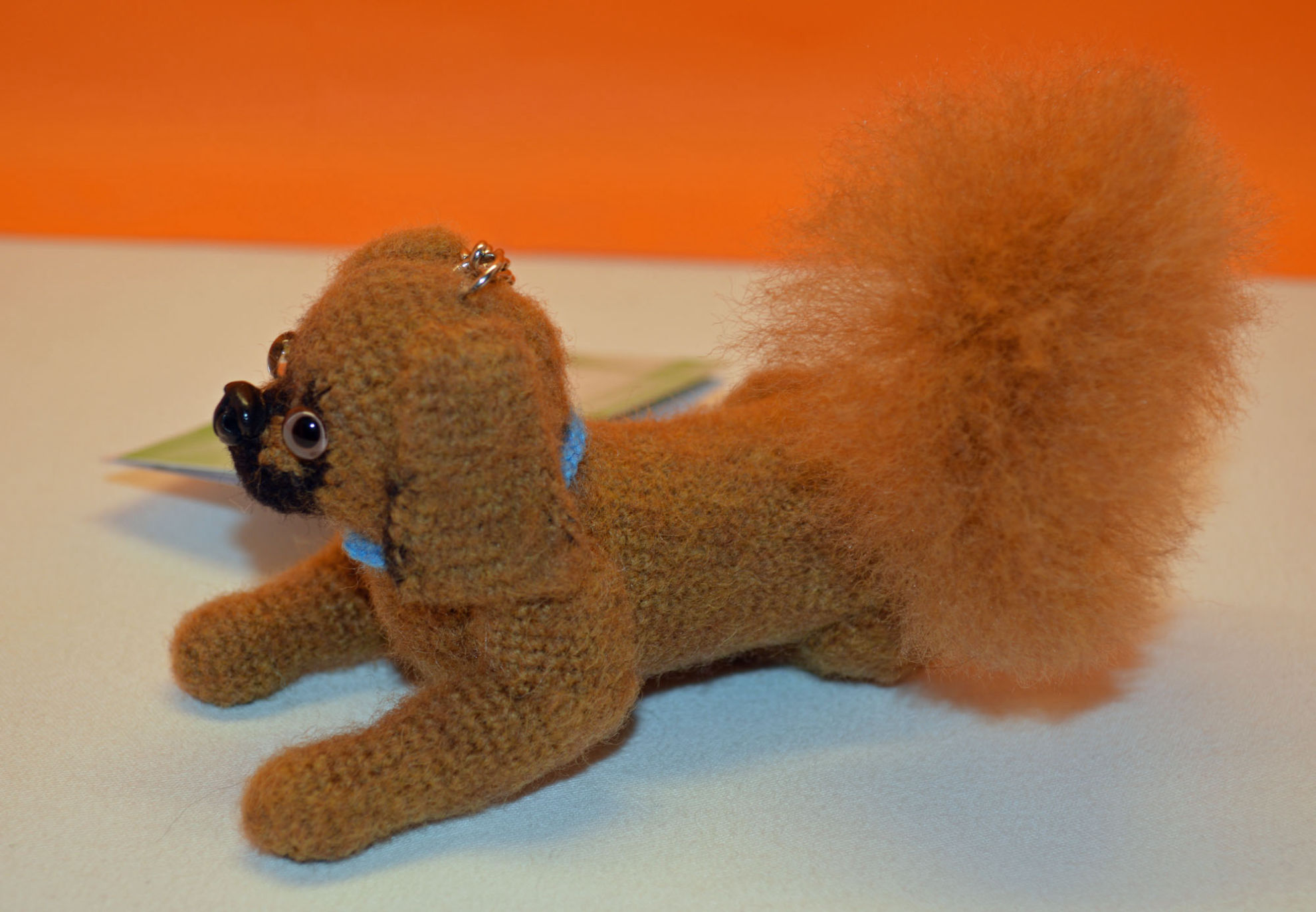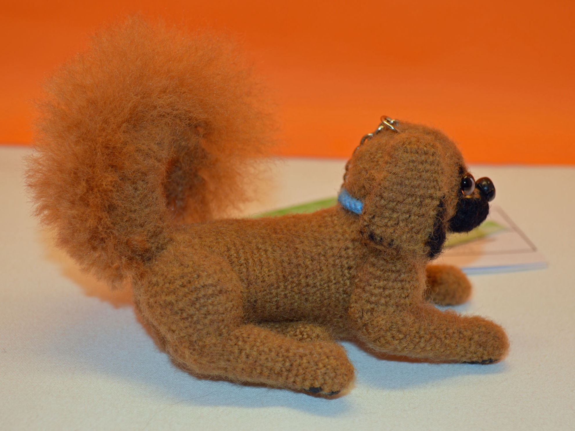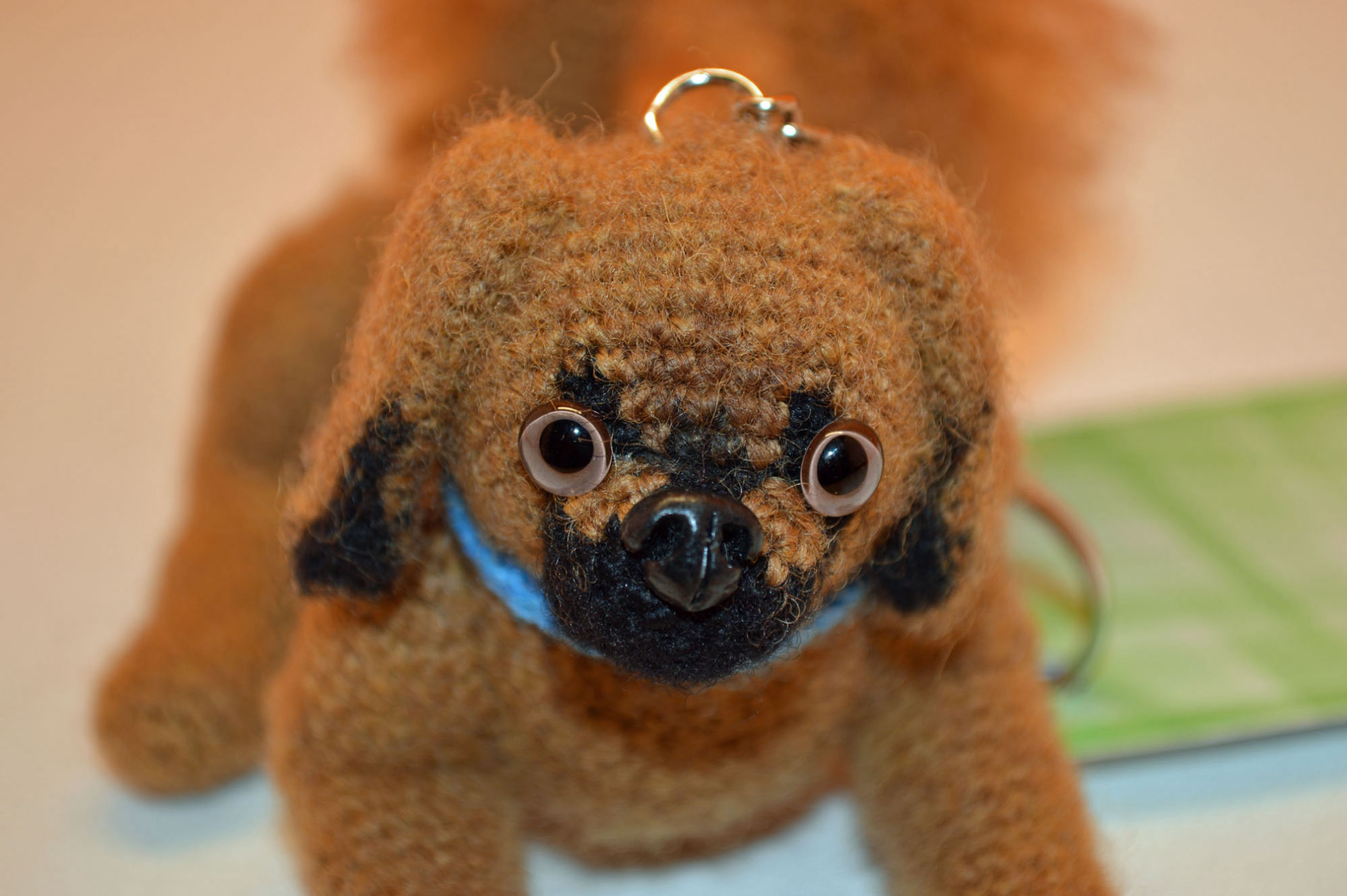 Material: Wolle Schwarz, Camel, Hellblau, Fimo (Hundenasen selbst gemacht), Bauernmalfarbe, Glasaugen, Bastelwatte