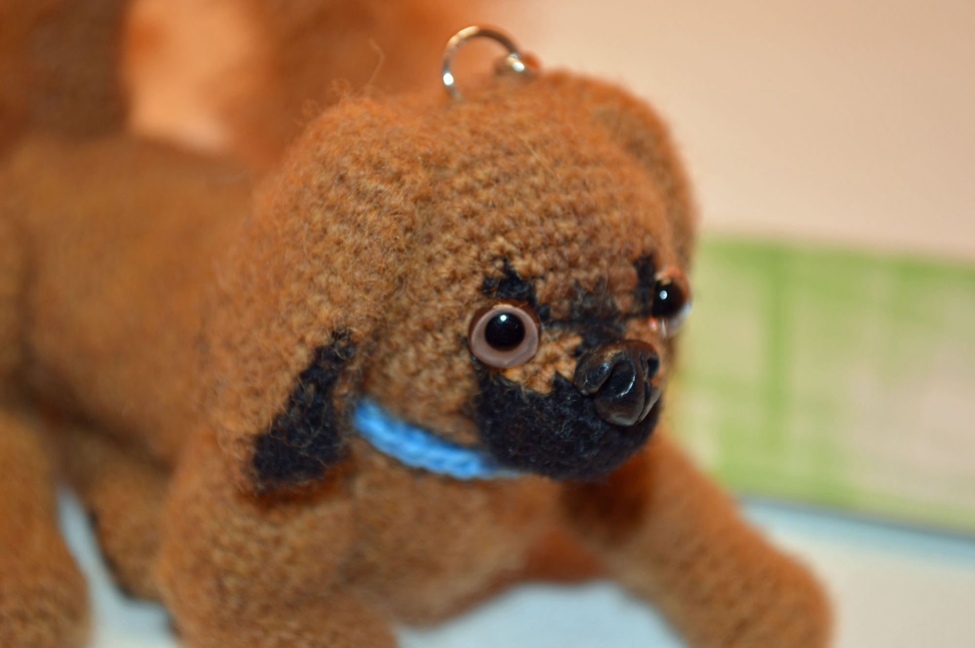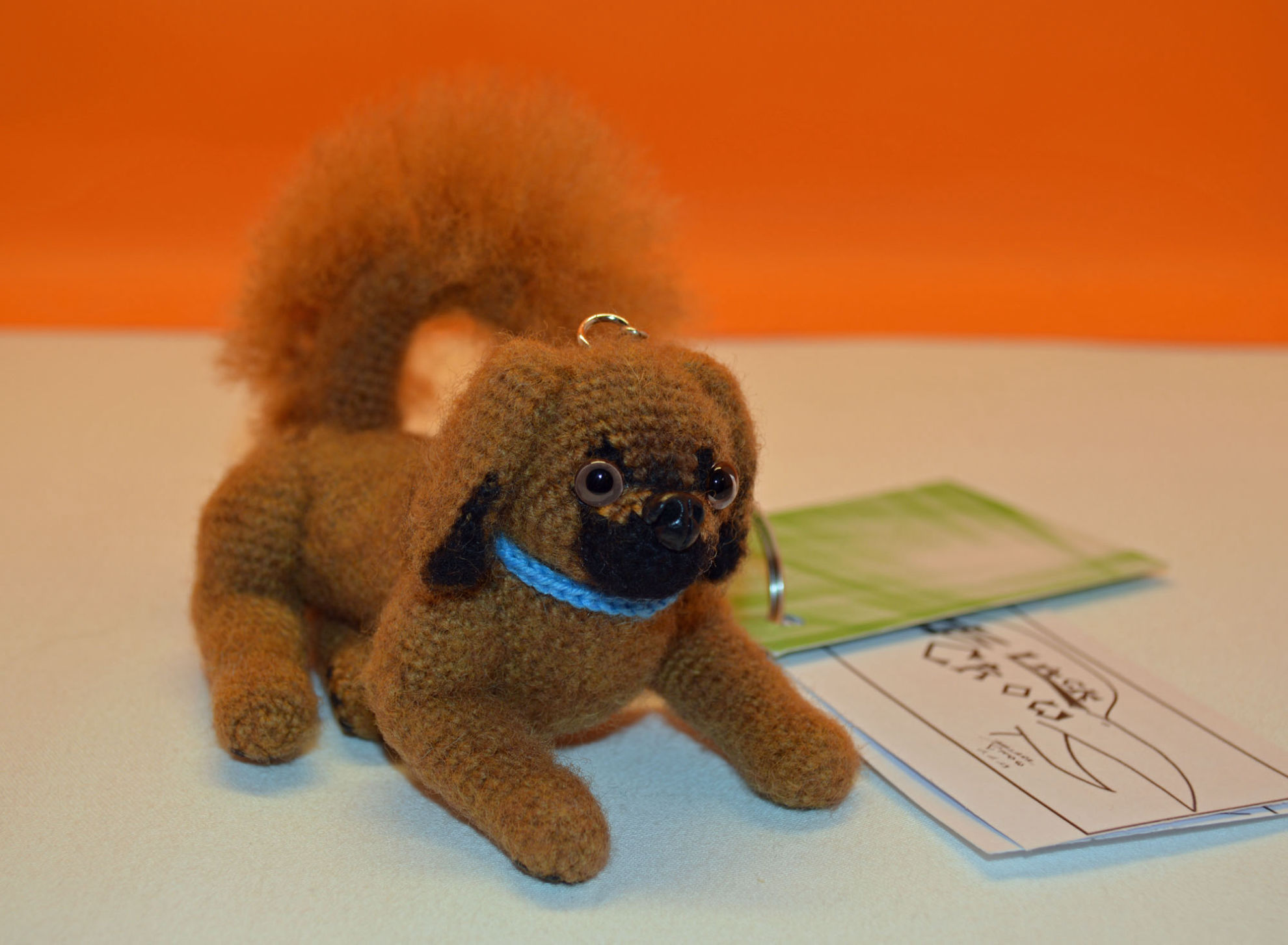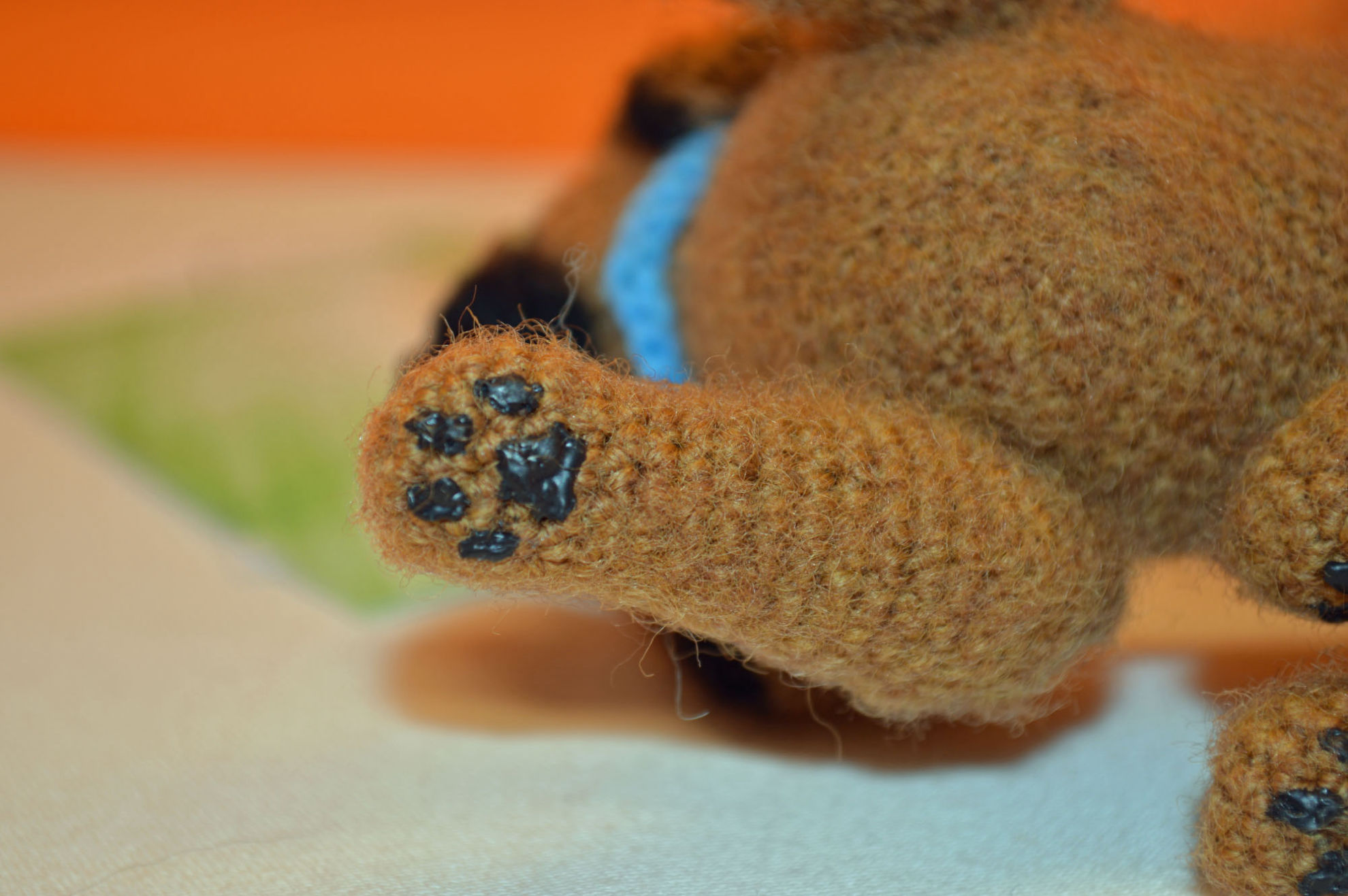 Material: Wolle Schwarz, Camel, Hellblau, Fimo (Hundenasen selbst gemacht), Bauernmalfarbe, Glasaugen, Bastelwatte